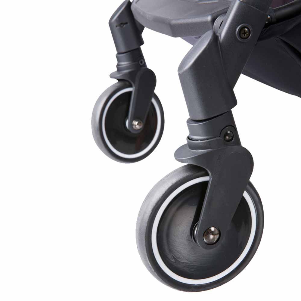 - Shock Absorbing wheel system with 360 degree Swivel Lockable System. The Rough Roads, the Grass, the Slopes, the Desert - Stroll anywhere with your Baby.
