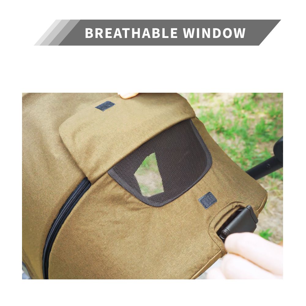 - Extra wide canopy with UV50+ protection, featuring an extendable zipper and peek-a-boo window for visibility.