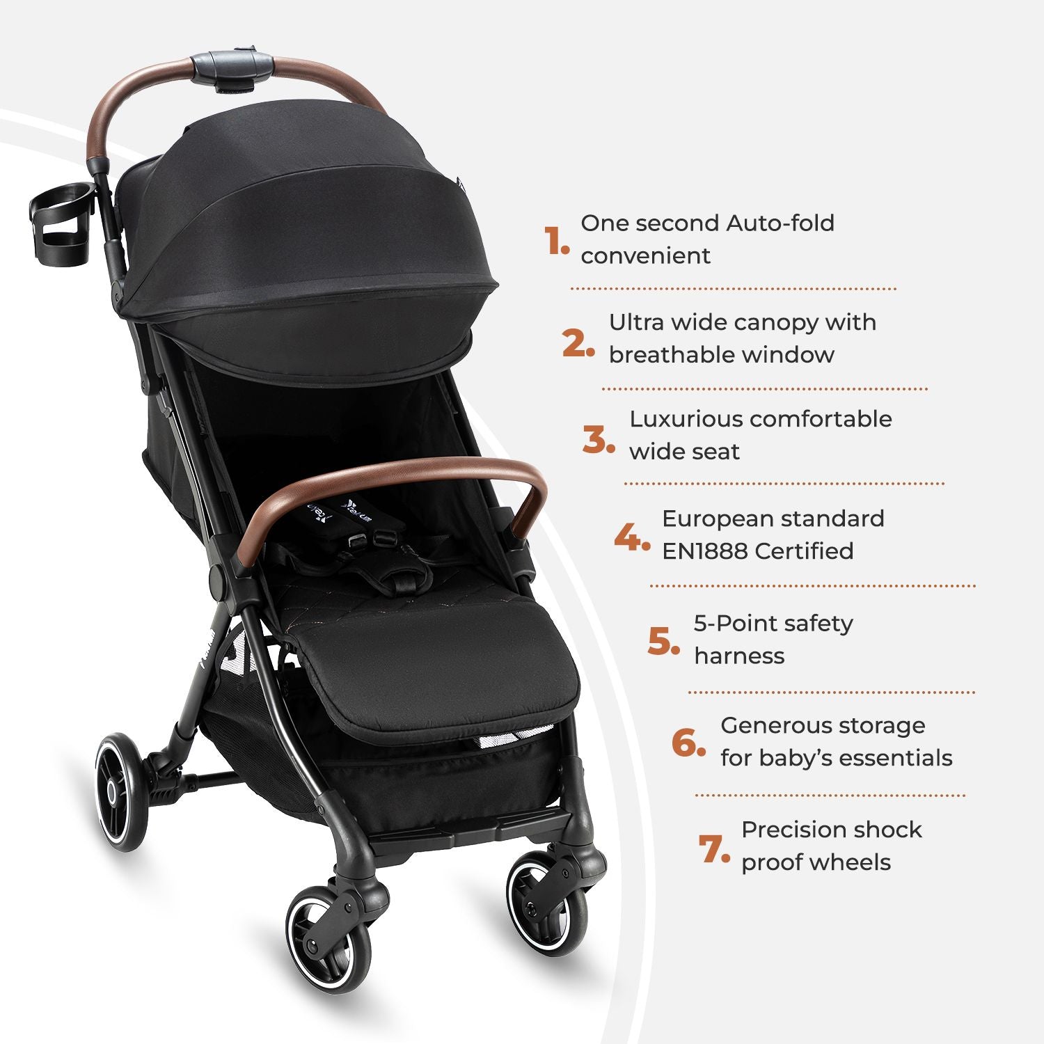 - Compact Auto-Fold Tech: Effortlessly collapse the stroller with One sec single hand fold and simply stroll the stroller away.