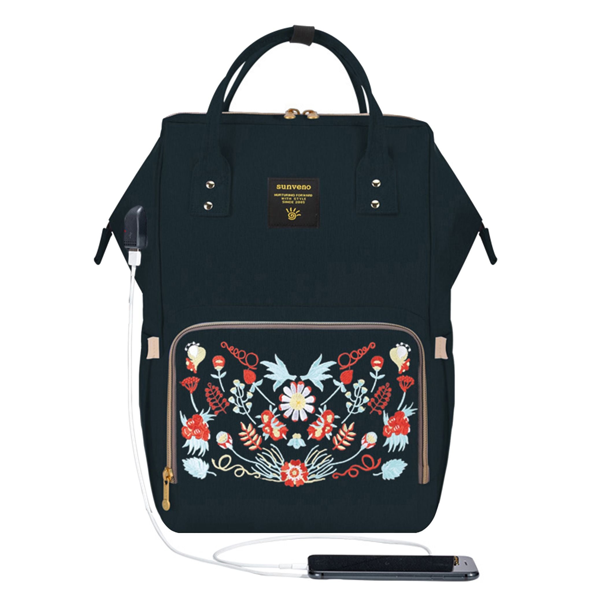 This combo comes with USB Sunveno Embroidery diaper bag in Black. The unique features being the back opening zipper and tissue/wipes holder side pocket, both of these allow you easy access when you need tissues and clothes handy, A new ultra feature is the USB port to charge your phone with a power bank connected via Diaper bag USB port.