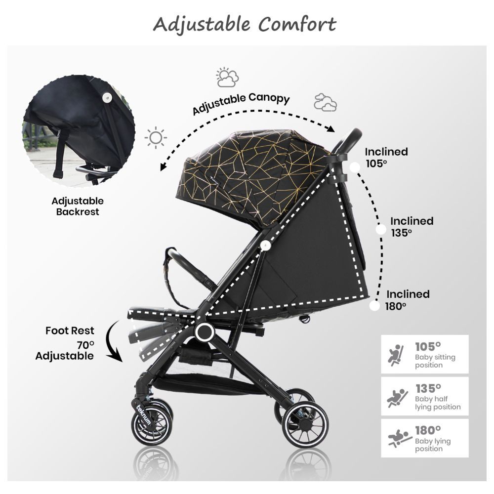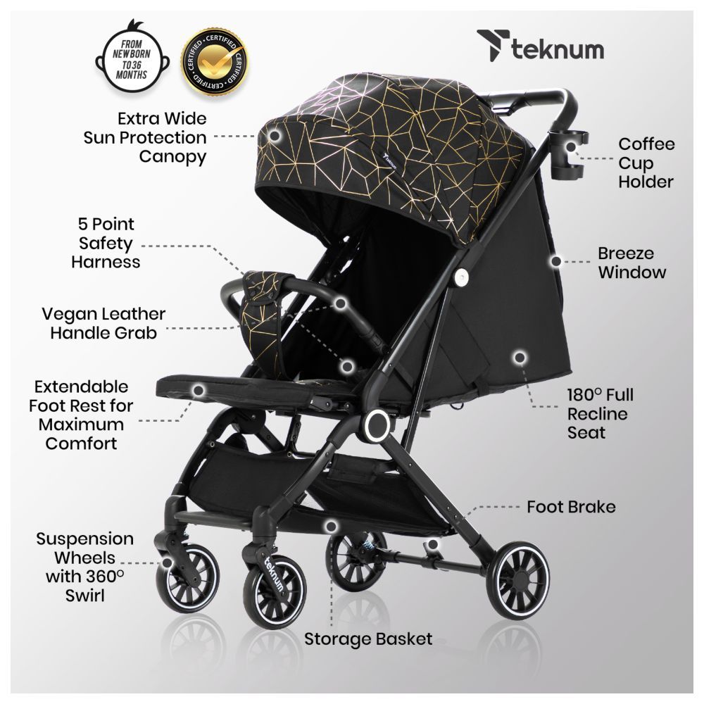 The Teknum TravelZen Stroller is an absolute travel essential, providing total convenience without compromising on comfort or style. Whether you're on holidays, exploring the latest urban hotspot, or simply on the move, the Teknum TravelZen Stroller is perfectly in tune with the needs of modern parents, seat can be reclined as per need, Comes with Big Back window. The 5.5"" front and 6"" rear wheels of the Teknum TravelZen Stroller were cleverly designed to allow parents to confidently maneuver on different surfaces throughout their day. Boasting breathable fabric, your child will keep cool even on the hottest days, while a lightweight design makes strolling an absolute breeze. And for when it's time to travel, the unique compact Push Button folding mechanism reduces the stroller and easily fits in the Airplane cabin or Boot space of any Car or The Unique Push Trolley Handle makes it extra convenient to simply stroll. It perfect for exploring new places, near or far with 5 - point safety harness suitable for Kids from 0 months to approximately 4 years (up to 22 Kg / 48 Lbs.) This stroller is exceptionally safe, certified to meet EU standards, making it the perfect choice for your baby.