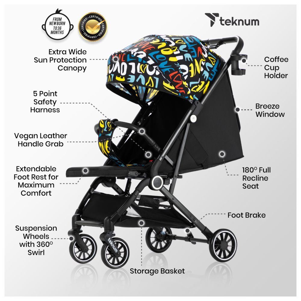The Teknum TravelZen Stroller is an absolute travel essential, providing total convenience without compromising on comfort or style. Whether you're on holidays, exploring the latest urban hotspot, or simply on the move, the Teknum TravelZen Stroller is perfectly in tune with the needs of modern parents, seat can be reclined as per need, Comes with Big Back window. The 5.5"" front and 6"" rear wheels of the Teknum TravelZen Stroller were cleverly designed to allow parents to confidently maneuver on different surfaces throughout their day. Boasting breathable fabric, your child will keep cool even on the hottest days, while a lightweight design makes strolling an absolute breeze. And for when it's time to travel, the unique compact Push Button folding mechanism reduces the stroller and easily fits in the Airplane cabin or Boot space of any Car or The Unique Push Trolley Handle makes it extra convenient to simply stroll. It perfect for exploring new places, near or far with 5 - point safety harness suitable for Kids from 0 months to approximately 4 years (up to 22 Kg / 48 Lbs.) This stroller is exceptionally safe, certified to meet EU standards, making it the perfect choice for your baby.