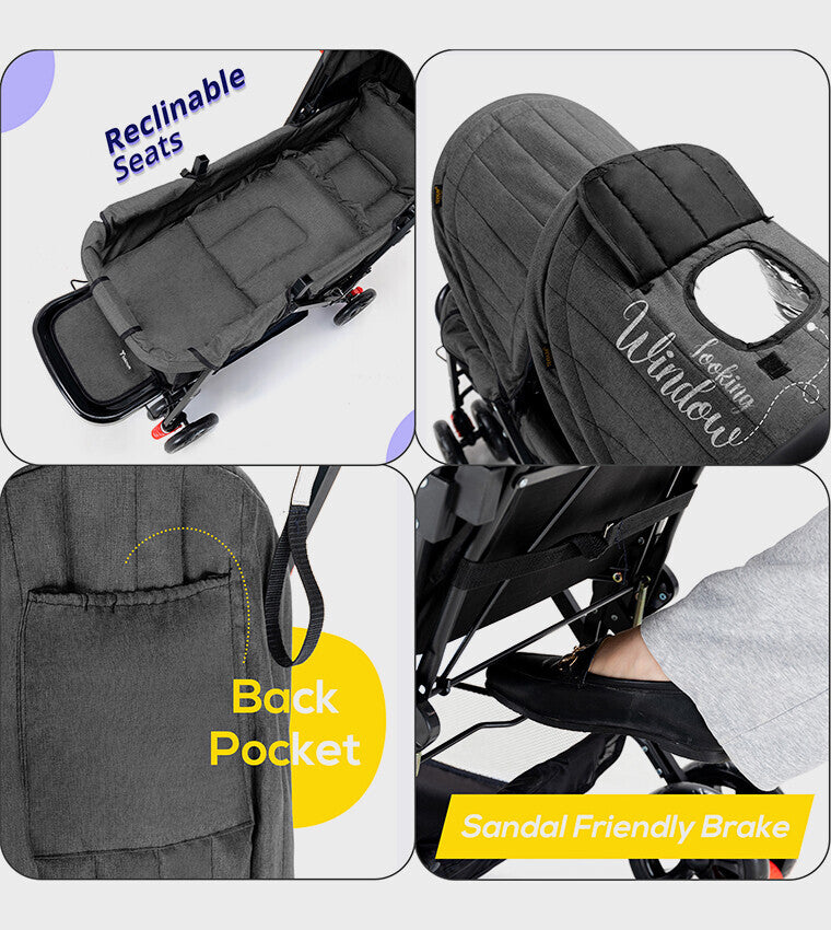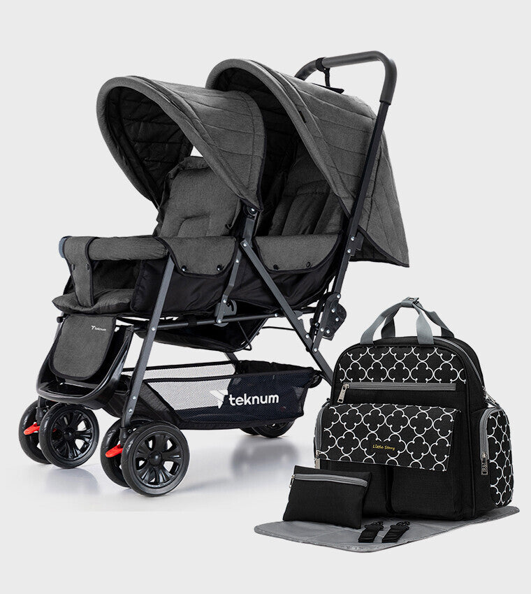 Teknum Double Stroller is perfect to make some memorable stories together as a family. Ideal for twins or siblings, this Stroller is so smooth to ride and slim to pass though the standard gates. The front seat and the back seat can be inclined flat to let the baby sleep comfortably. Made of linen and cushioned seats provide absolute comfort for your little one. A Big Cart basket is enough to carry a lot of items for the twins. Front wheels have smooth swivel and foot activated locks. The Canopy have a transparent cover for the baby to feel comfortable. It's single hand folding system with easy storage while travelling.