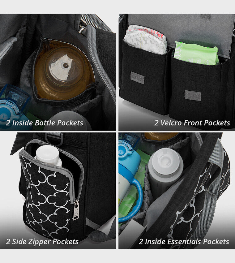 - 7 internal and external pockets including an internal zipped pocket for valuable items 1 outer zipped pocket for easy access to essentials 2 Insulated Tin-Foiled Bottle Chambers to keep the bottles and sippers upright and at just the right temperature for easy feeding on the go.