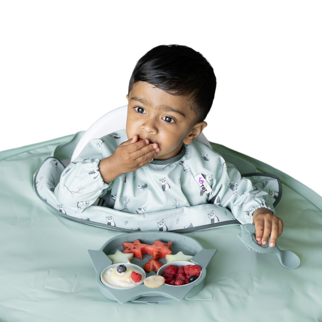 The perfect compact weaning bib, making mealtimes and messy play easier for baby and you!