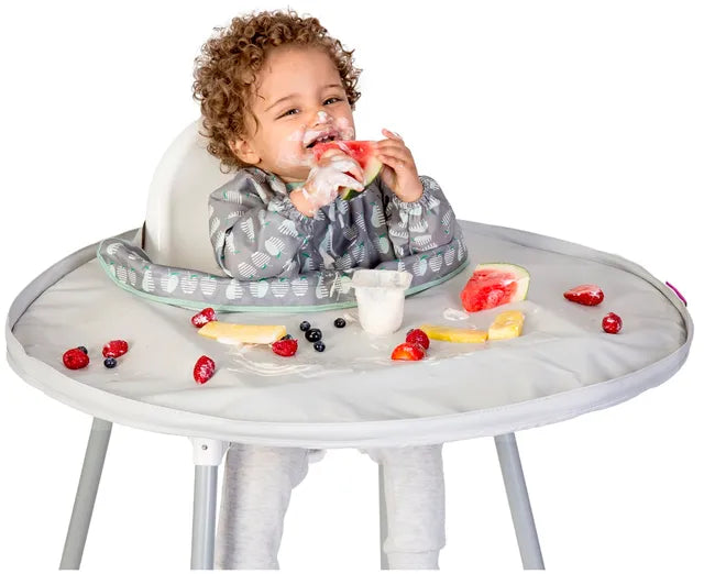 Cuts clean-up time in half! So easy to clean; wash or wipe the tray in the sink and machine wash the long-sleeve crumb catcher bib.