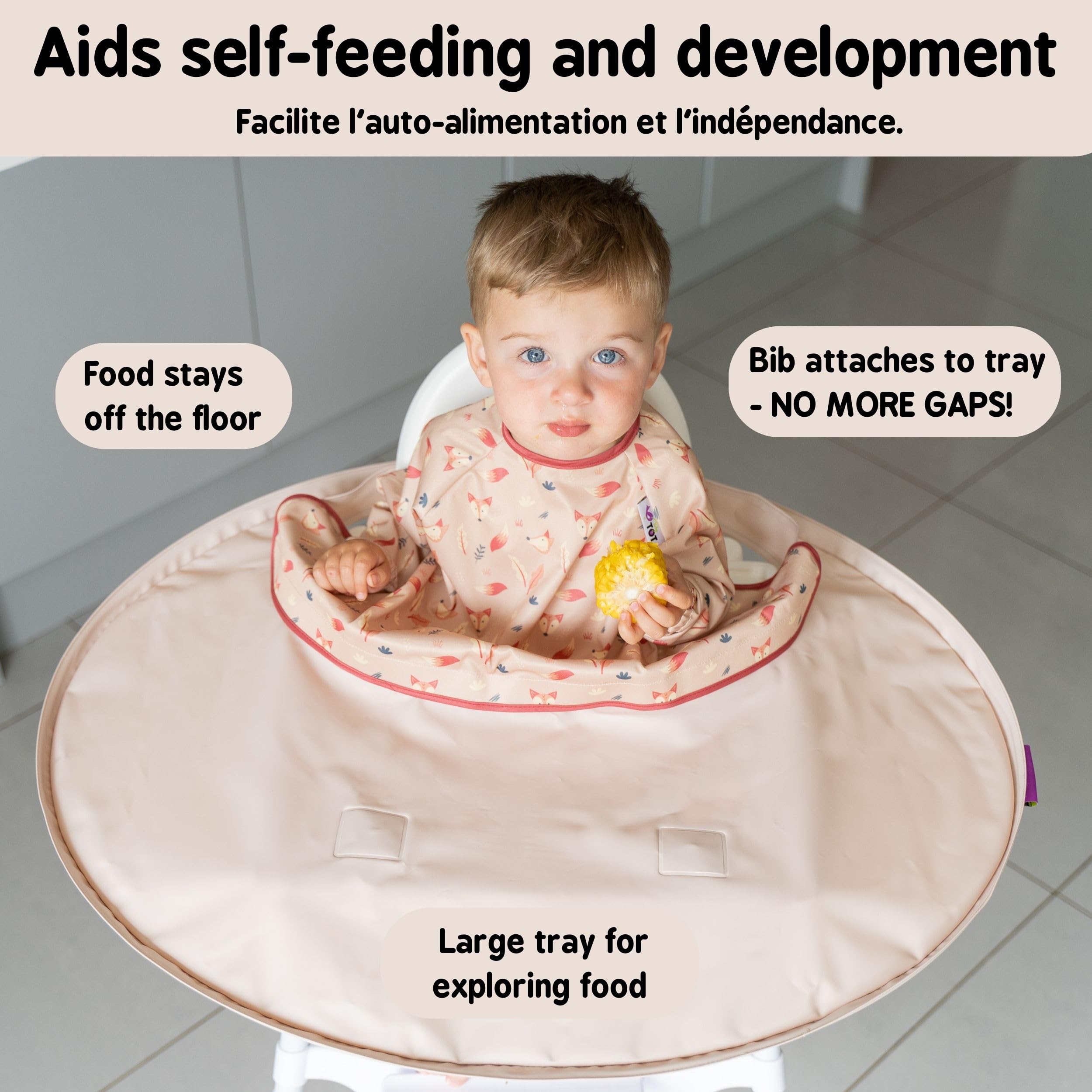 Long sleeve waterproof bib and portable tray kit that completely protects baby, highchair and floor from food mess and spills. Essential for traditional puree weaning, baby-led weaning BLW and all messy play activities. Bib attaches to tray for no more gaps!