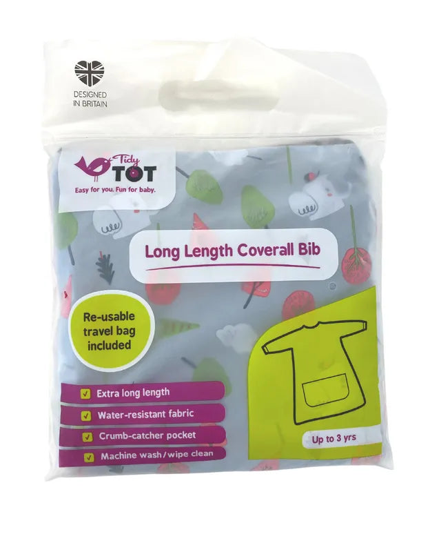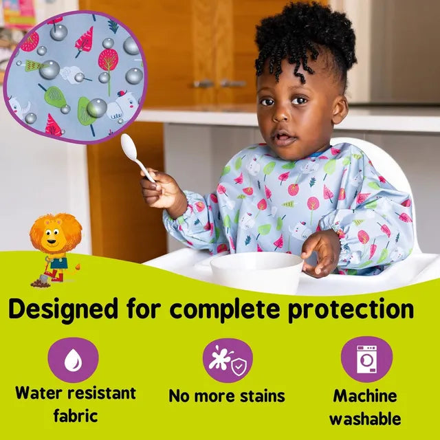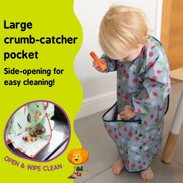 Perfectly designed for both mealtimes and playtimes the long sleeves and full cover fastening at the back of the bib give full 360-degree protection to clothes. An adjustable neck fastening and soft fabric sleeves allow for a snug and comfortable fit from early weaning up to 3 years old. Perfect for keeping your little one clean as they learn to self-feed independently, engage in water play, painting, baking and general mischief making!