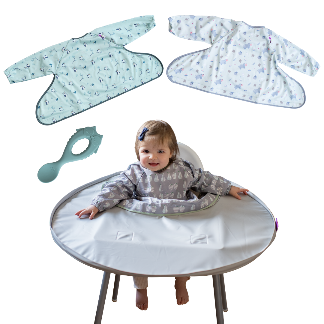 Includes 3 x Coverall Bibs, 1 x Tray & 1 Silicone spoon