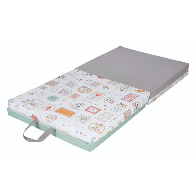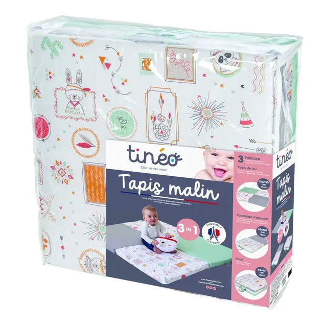 The Indian Spirit play mat is a 3 in 1 multifunctional smart mat: Unfolded, it offers a real play mat (120 cm x 120 cm) Folded in 2, it becomes an extra bed (120 cm x 60 cm x 8 cm) Folded in 3, it turns into a pouf for a booster seat and / or to easily store the product at the end of the day.