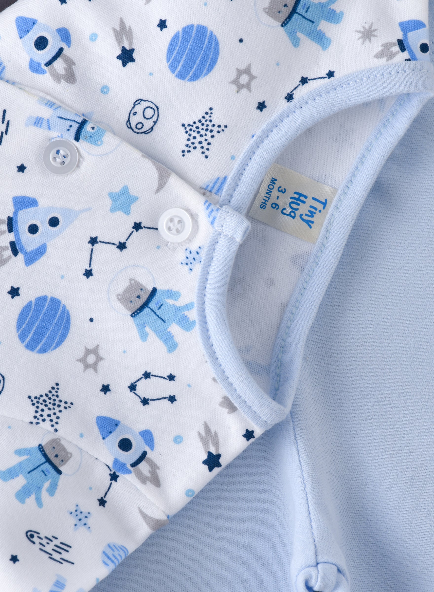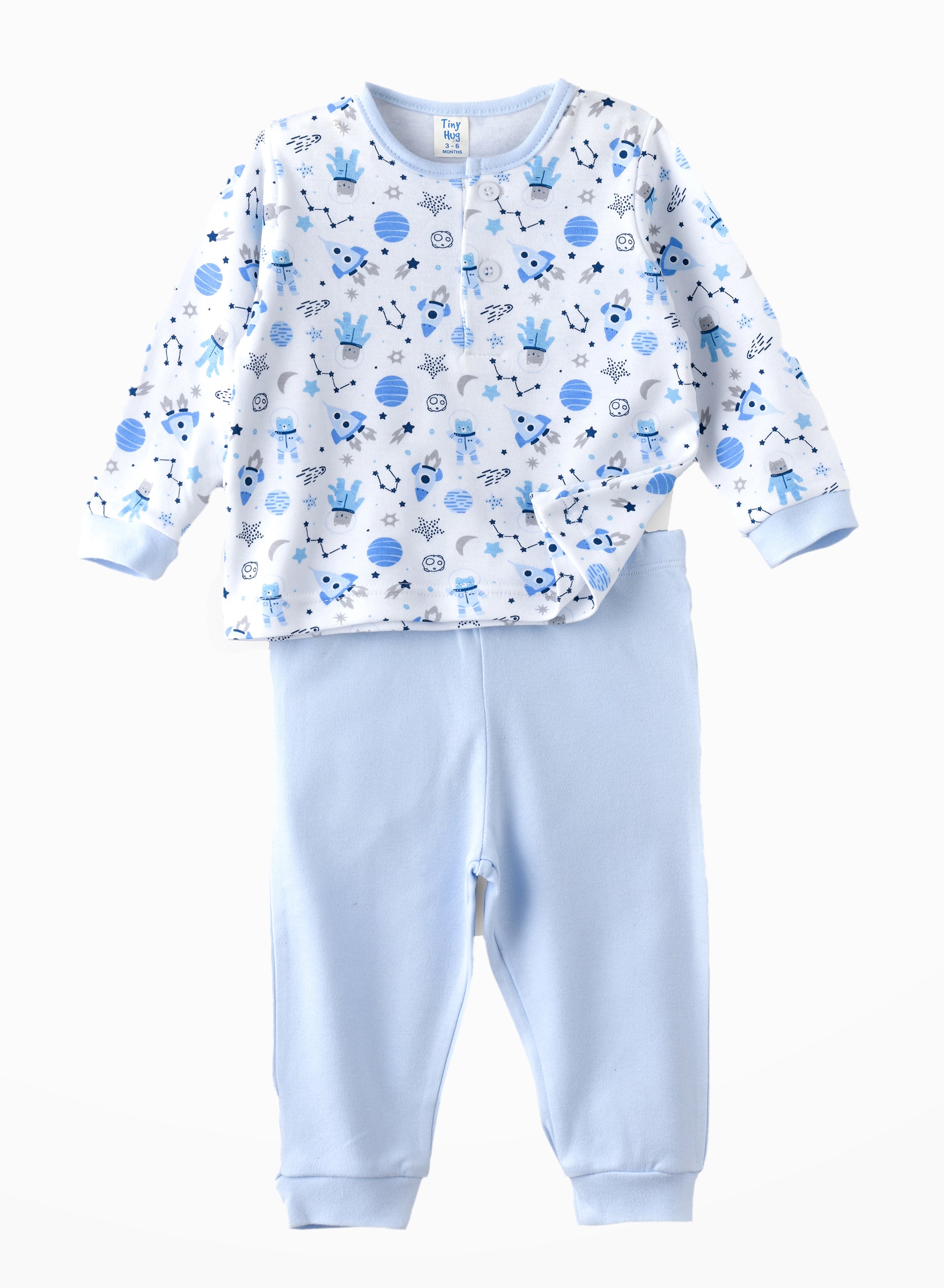 The Tiny Hug Kids Astronaut Print Pyjama Set is perfect for bedtime adventures. Made from soft cotton, this two-piece set includes a light blue top featuring an adorable astronaut-themed print and matching full-length pants. The long-sleeve design ensures your little one stays cozy and warm all night, while the elastic waist and button closure provide comfort and ease of wear. Ideal for both sleepwear and lounging at home, this set is a must-have for your child's wardrobe.