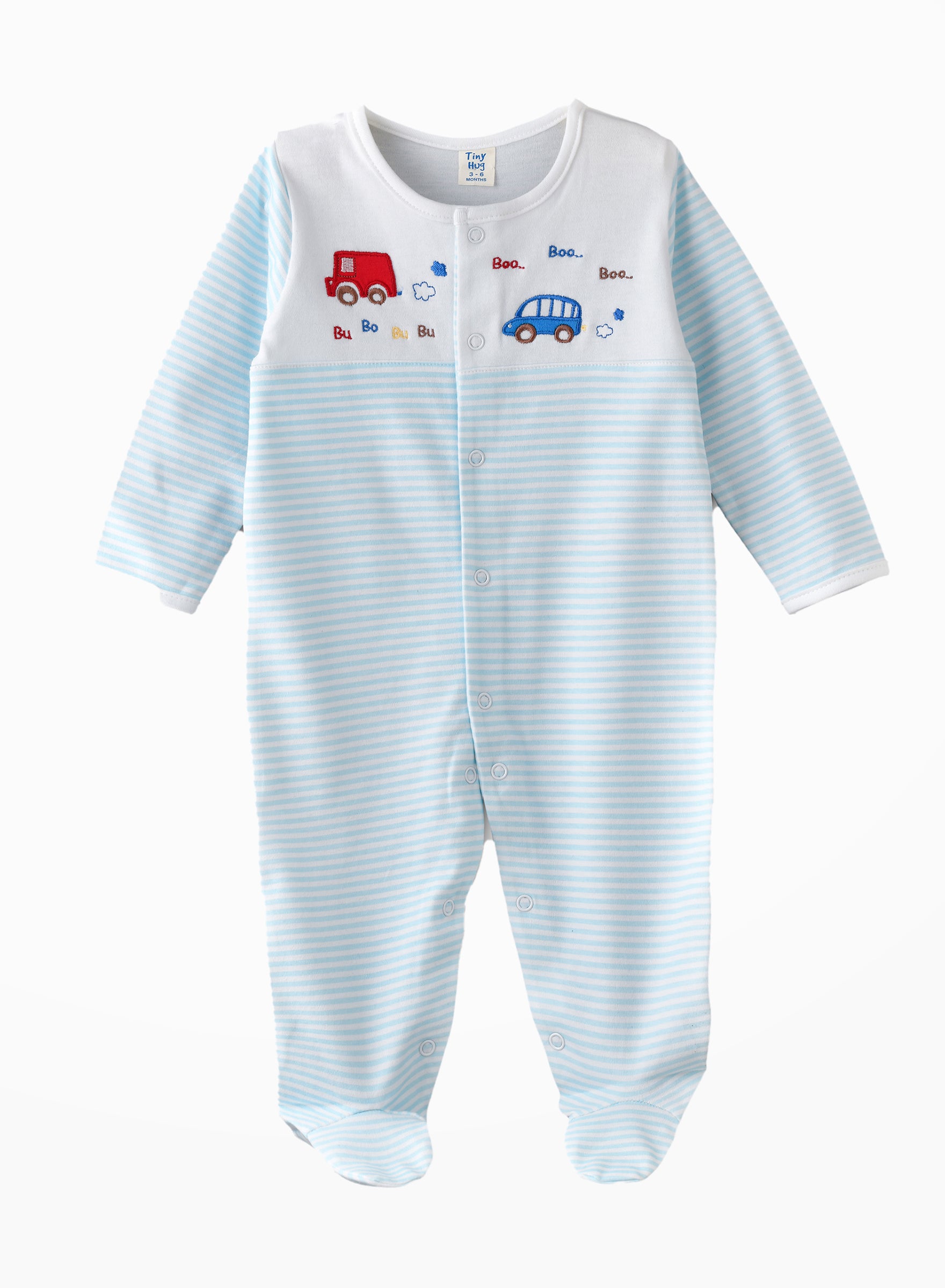 The Tiny Hug Baby Boys' Striped Car Print Footed Sleepsuit is designed to keep your little one cozy and comfortable. Made from soft and breathable cotton, this sleepsuit features a playful car print on a light blue and white striped base. The footed design ensures full coverage and warmth, making it perfect for bedtime or lounging around.
