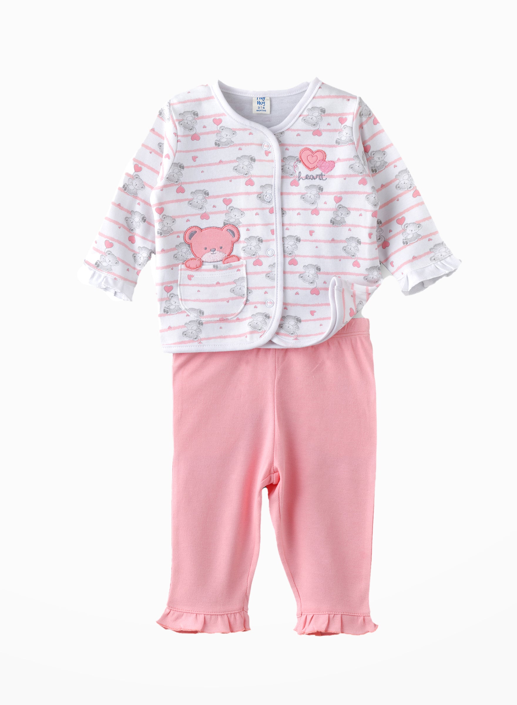 The Tiny Hug Baby Girls' Teddy Bear Print 2-Piece Pyjama Set is the perfect combination of comfort and style for your little one. Crafted from soft cotton, this set features a long-sleeve top with an adorable teddy bear print and matching pink pants with ruffled hems. The front snap button closure makes it easy to dress your baby, while the elastic waistband ensures a snug and comfortable fit. The playful design is ideal for bedtime and lounging, making it a delightful addition to your baby's wardrobe.