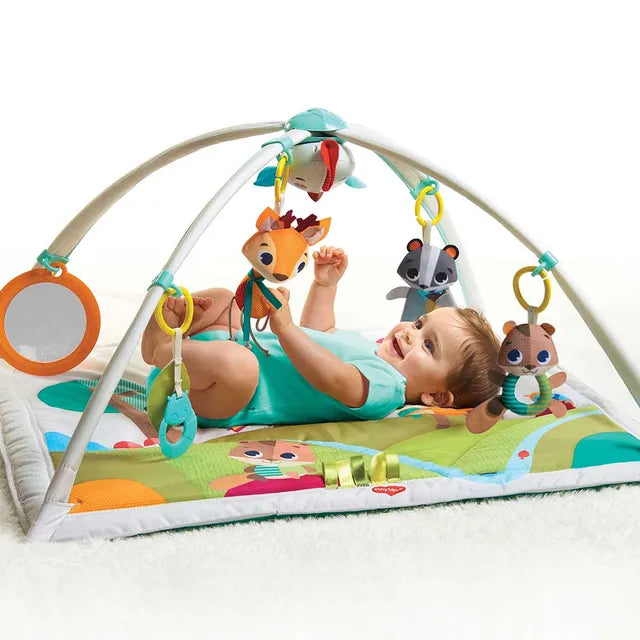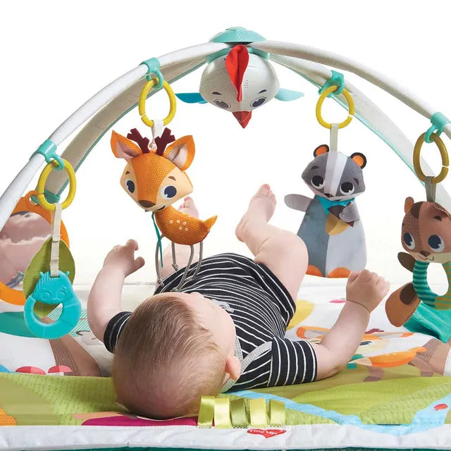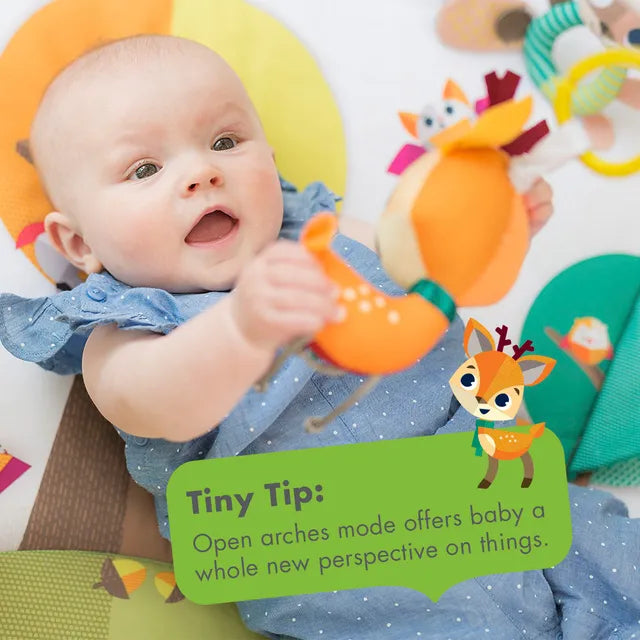 Uniquely desiged 2-in-1 baby activity mat with adjustable arches provides an adaptable environment for baby's continued growth and development. Electronic bird toy with engaging lights & music feedback, including 30 mins of music and 20 different tunes, can also be used as an adorable take-along. Selection of soft Into the Forest dolls and various activities will keep baby engaged and happy. Open arches mode offers baby a whole new perspective on things. The Gymini's various features have been carefully conceived to support babies 7 developmental wonders, including motor skills, visual and auditory cognition, and the senses. Part of the Into the Forest collection! Sharing those special Moments of Wonder with baby
