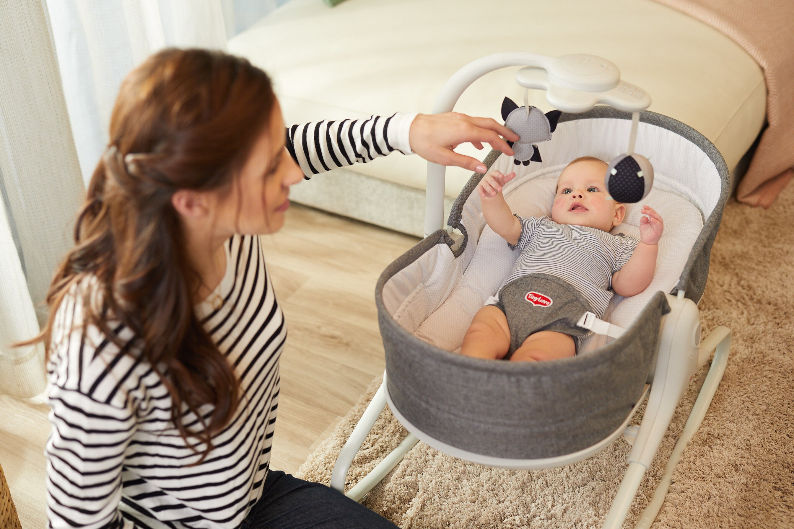 - Easy parental access with adjustable toy arm