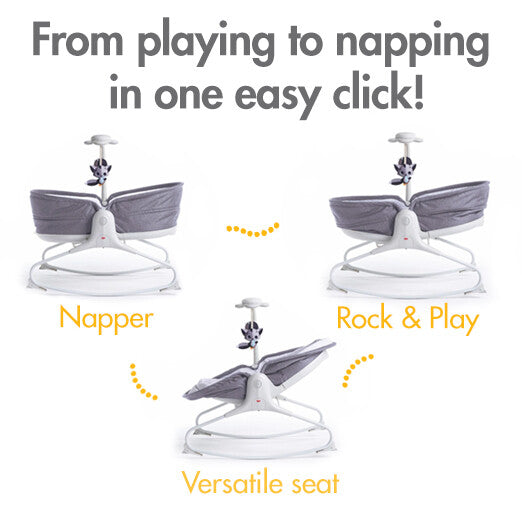 From playing to napping with one click! Uniquely designed grey rocker that easily converts into soothing, cozy napper.
