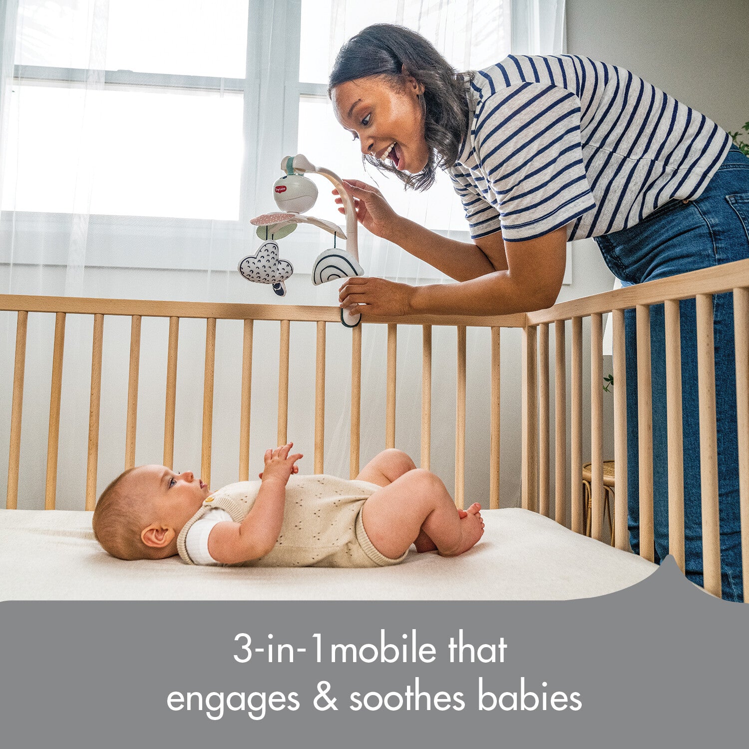 With 30 minutes of continuous music and 5 different melodies, this 3-in-1 Take Along Mobile keeps babies engaged and entertained at home and on-the-go. Comes with 3 easy connectors for attaching to play yards, travel coats, cribs, strollers and more, giving your little one a feeling of home away from home.