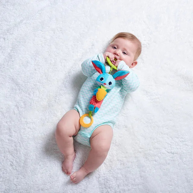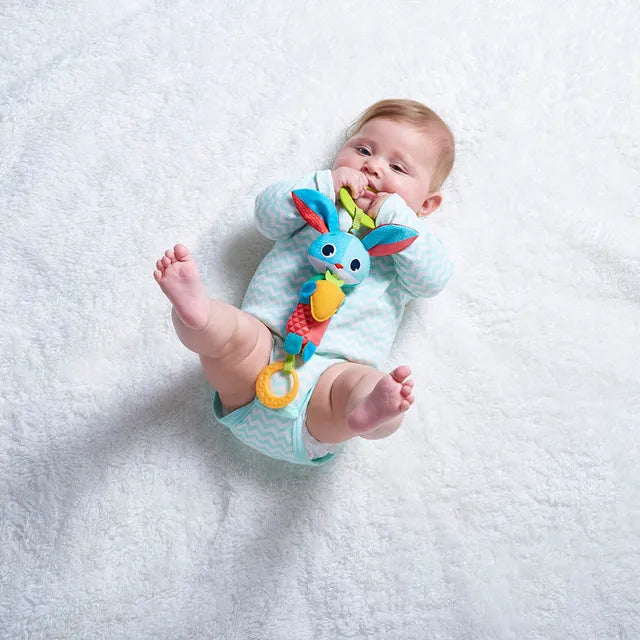 Charming on the go toy that produces sweet sounding audio feedback that stimulates the senses and helps develop fine motor skills. Engaging high-contrast basic colors especially appropriate for young babies. Featuring Thomas, an all-smiles inquisitive bunny named after the great inventor, Thomas Edison