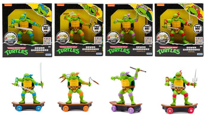 The Teenage Mutant Ninja Turtles Sewer Shredders are 5inch skate toys built to battle and cruise! Classically designed with your favorite Teenage Mutant Ninja Turtles holding their weapon of choice. Pull back the Ninja Turtle, let it go and watch it ride! Press the button on the Turtles half shells to initiate battle mode! Collect all 4 characters!