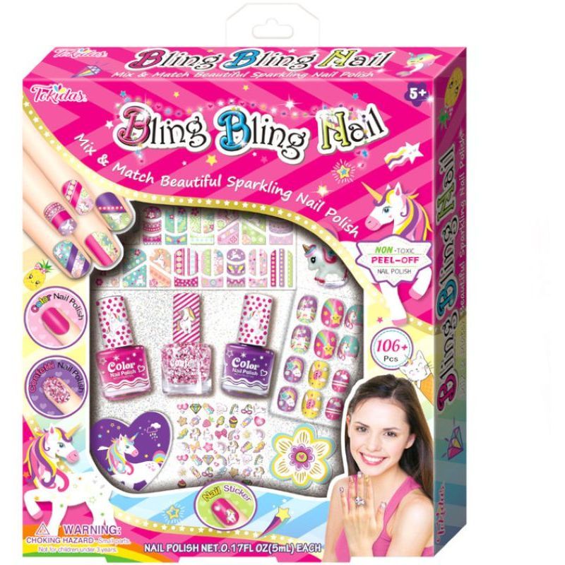 Includes: 3 Bottles of Nail Polishes, 12Pcs Press-on Nails, 1 Sheet of Nail Stickers, 1 Sheet of Nail Patches, 2 Nail Files, 1 Ring