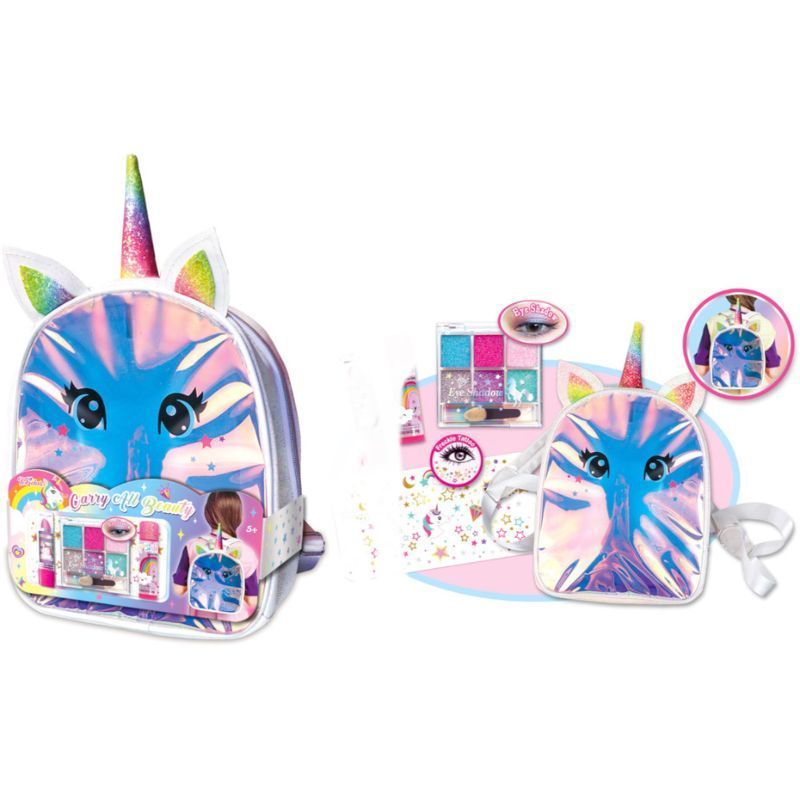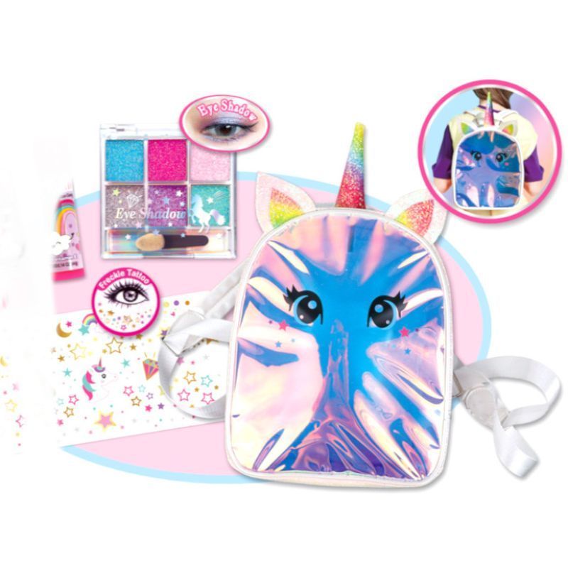 Carry yourself with style on your own Tokidas carry-all-beauty set! Makes up of a unicorn bag with plenty of space work make up accessories. Enjoy beauty wherever you go!, Contains:1 Backpack, 1 Five Colours Eyeshadow.1 Lipstick.1 Glitter Lip Gloss.1 Sheet of Freckle Metallic Tattoos