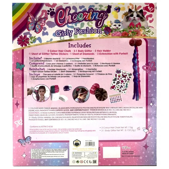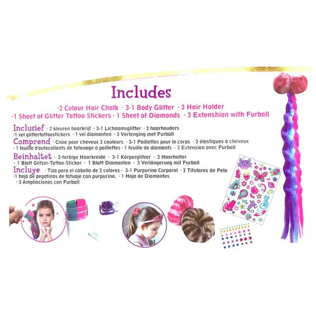 This makeup set is a wonderful toy for girls to play role game with friends to keep your child entertained for hours!Pretend play can also help your child promotes creativity, cognitive development, Improve her aesthetics and even social skills. The portable design allows your princess to enjoy the fun of makeup anywhere. , , 2 Colour Hair Chalk, 3-1 Body Glitter, 2 Hair Holder, 1 Sheet of Glitter Tattoo, 1 Sheet of Diamonds, 3 Extenshion with Furball