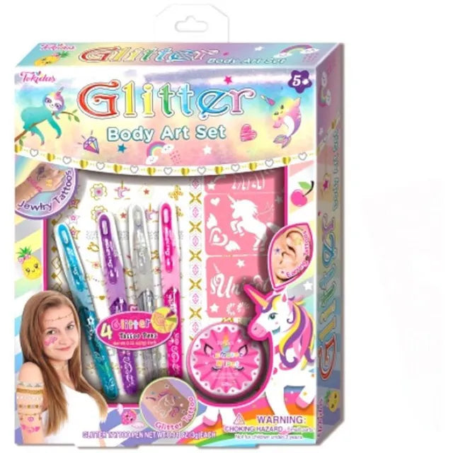 Includes: 4 Glitter Gel Pens, 3 Reuseable Stencils, 1 Sheet of Metallic Tattoo Stickers, 1 Remover.