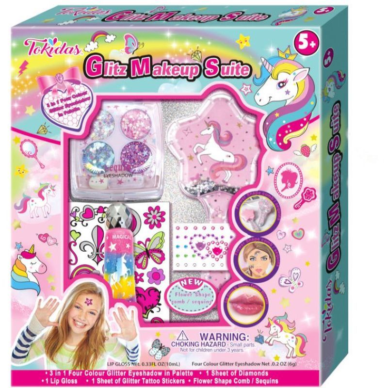 Dazzle your way to glamour on the Glitz makeup suite. Different make up tries to put on and enjoy with friends and family., Contains:3 in 1 Four Colour Glitter Eyeshadow in Palette ,1 Lip Gloss, 1 Flower Shape Comb / sequins,1 Sheet of Glitter Tattoo Stickers, 1 Sheet of Diamond Tattoo Stickers