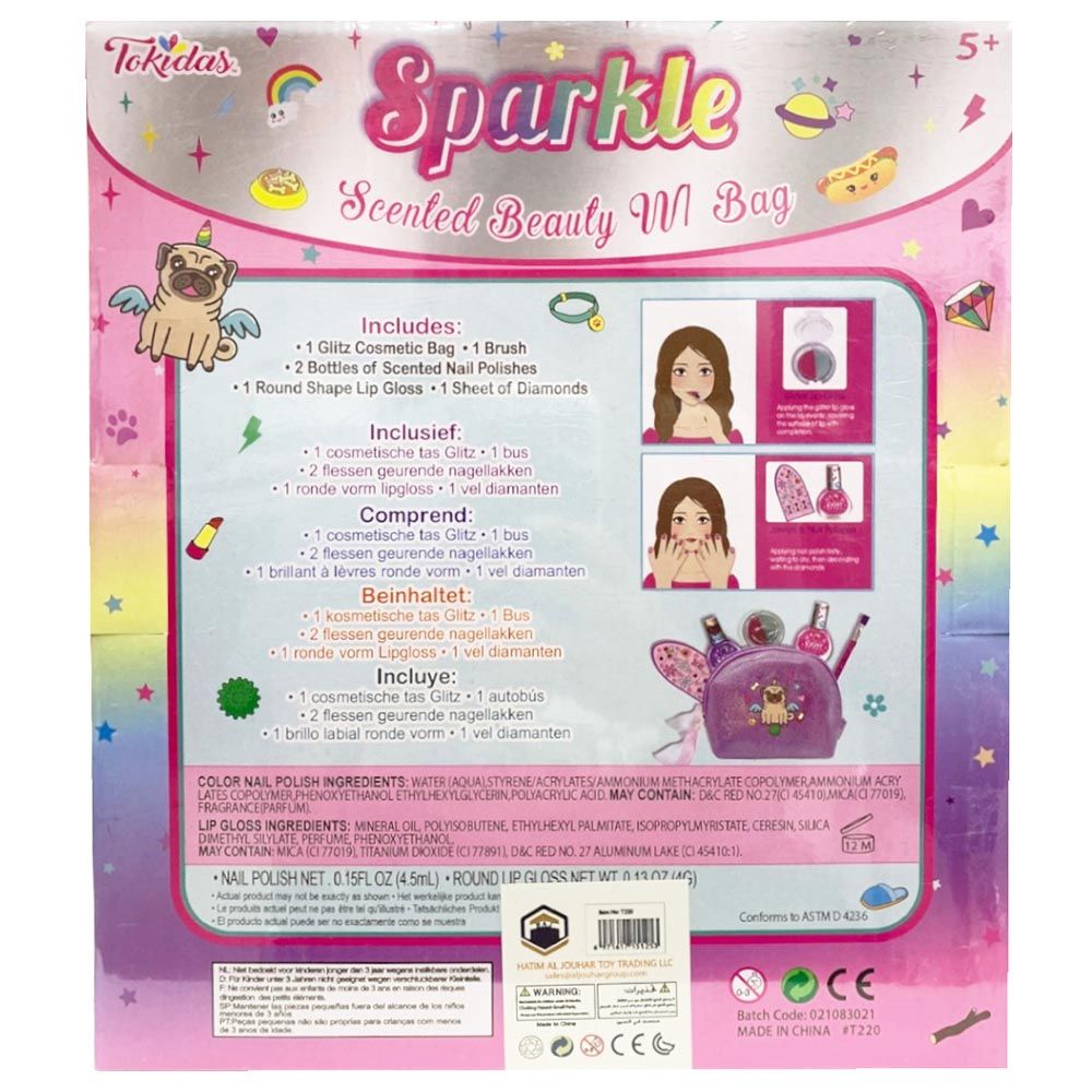 Cool Tokidas children's cosmetics for little fashionistas. Every girl will find the perfect set of Tokidas cosmetics! Nail polishes, shadows, lipsticks, glosses, bright stickers and very beautiful cosmetics. , Includes: , 1 Glitz Cosmetic bag , 1 brush , 2 bottles of scented nail polishes , 1 round shape lip gloss , 1 sheet of diamonds