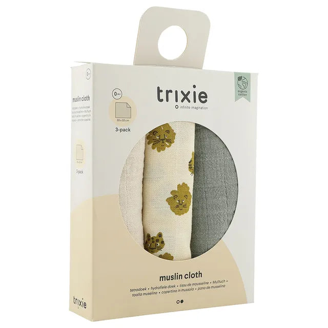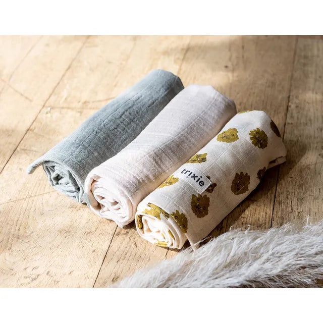 A new Trixie print combined with two solid colours creates a wonderful palette. The swaddles are high quality, 100% organic cotton and wrapped as a set. They are fully coloured and/or printed.