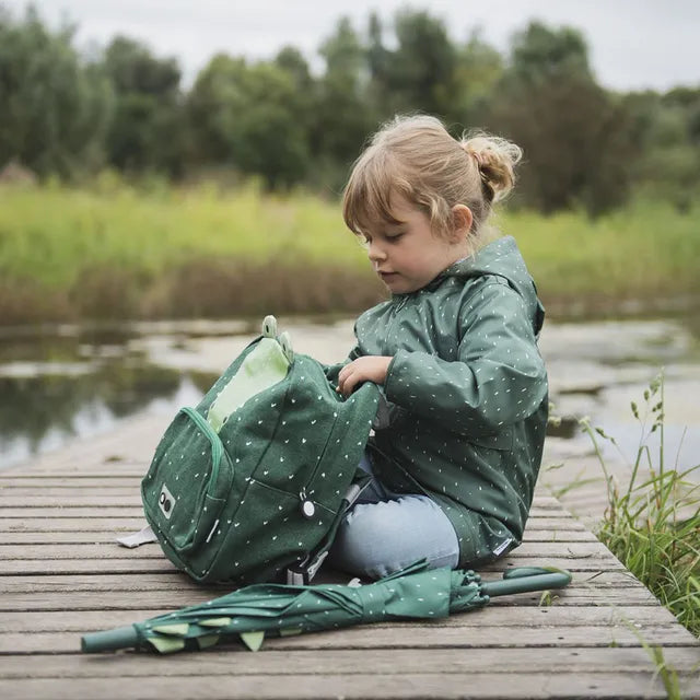 Let's go sing in the rain with our animal umbrellas, made out of recycled fabric! Instantly brighten up grey days with our smiling animal faces to keep your little one dry! When it rains this cheerful umbrella will brighten things up. You can choose between Mr. Polar Bear, Mr. Fox, Mrs. Elephant, Mrs. Rabbit, Mr. Monkey, Mr. Crocodile & Mr. Lion. Their floppy ears will cheerfully bounce around while your little one is jumping in the rain puddles! The umbrella is made of 100% recycled polyester. The safe sliding system to open and close the umbrella is especially designed for little fingers. The umbrella has a strong, high quality and lightweight aluminium frame. The little strap with animal tail allows you to neatly store the umbrella when the sun is shining.