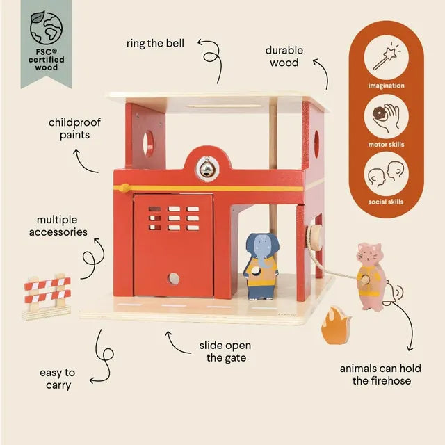 - The beautifully crafted fire station provides an engaging setting for imaginative play.