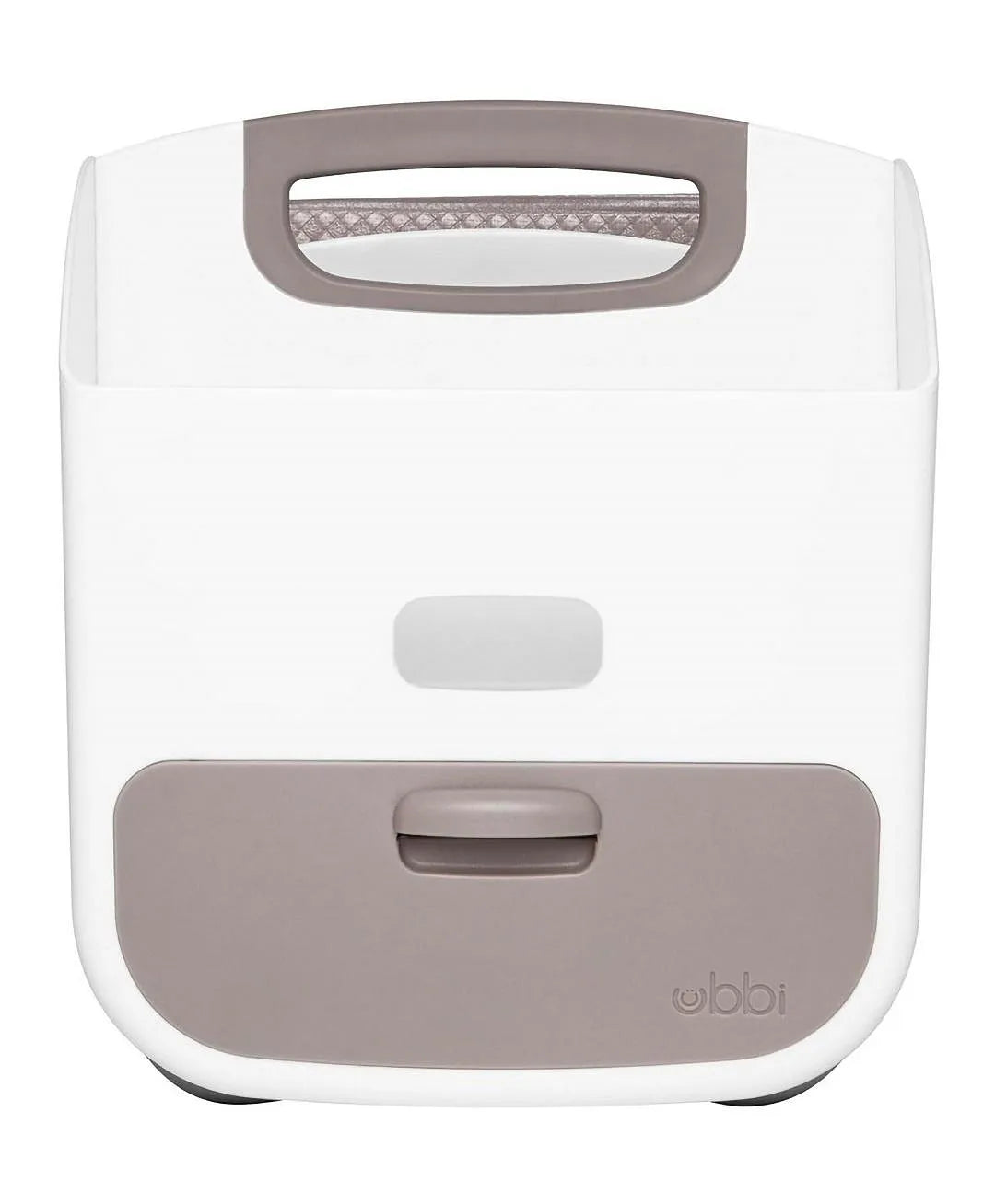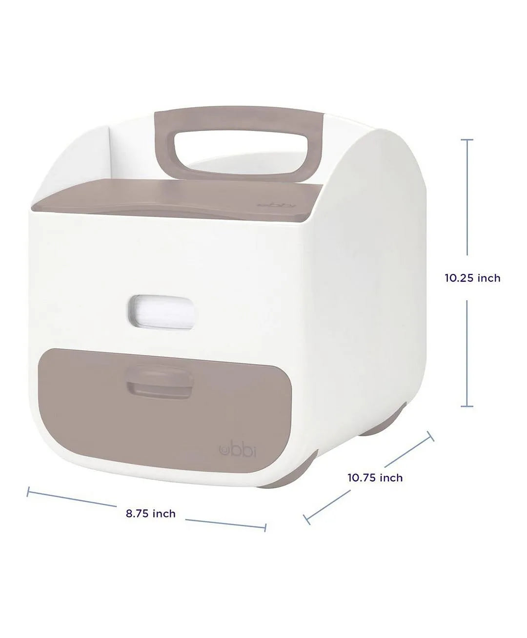 Ubbi Diaper Storage Caddy and Changing Mat keeps diapering essentials organized in a portable unit Made of sturdy plastic with two main compartments for diapers and wipes Includes a drawer for smaller items and a fitted, easy-to-clean changing mat Features an integrated handle and non-skid rubber feet for stability and portability Designed with a window that matches the Ubbi wipes dispenser for easy monitoring of wipes supply Compatible with most disposable wipes dispensers PVC, BPA & Phthalate free for safe use around babies Ubbi wipes dispenser sold separately