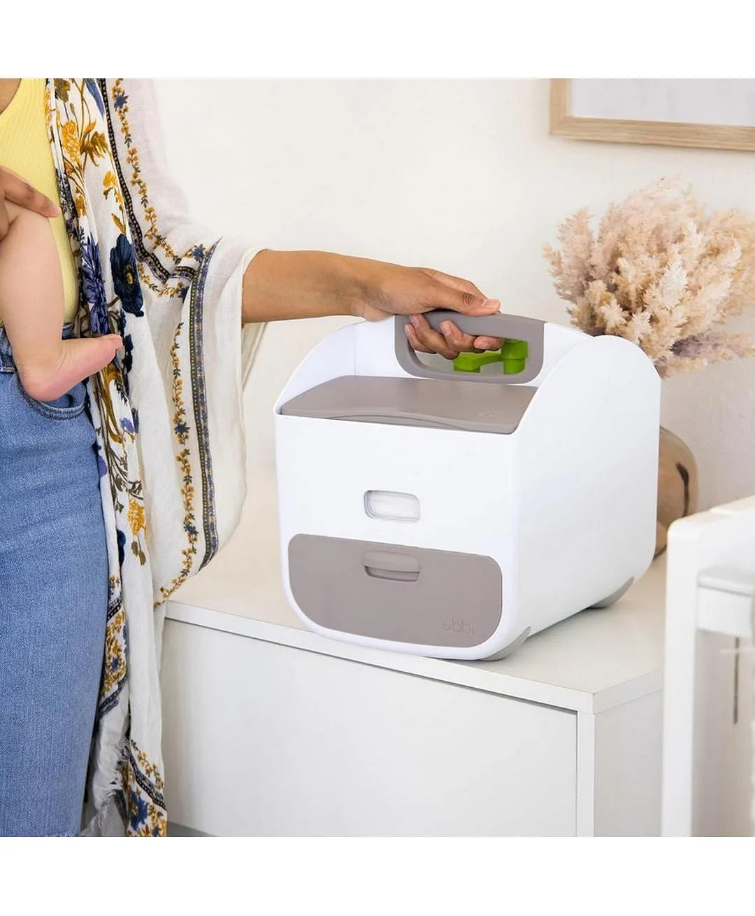 The Ubbi Diaper Storage Caddy and Changing Mat offers parents convenience, durability, and accessibility by keeping all diapering supplies organized in one portable unit. Made of sturdy plastic, this diaper caddy features two main compartments for diapers and wipes, a drawer for smaller essentials, and a fitted space that includes a comfortable, easy-to-clean changing mat. Designed for versatility, it has an integrated handle and non-skid rubber feet, allowing it to be carried around or stay securely in place. While the Ubbi diaper caddy fits most disposable wipes dispensers, it is specially designed with a window that aligns with the Ubbi branded wipes dispenser's window, making it easy to see when wipes are running low. PVC, BPA & Phthalate free. Ubbi wipes dispenser sold separately.