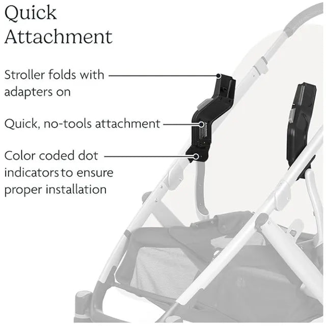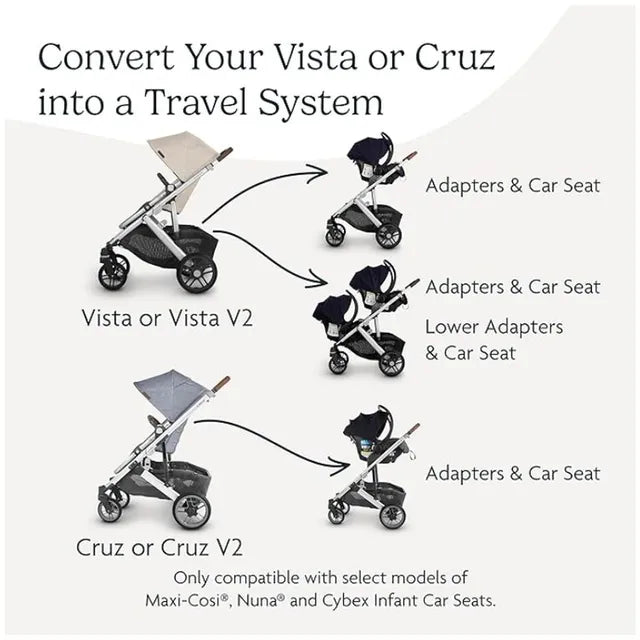 This set of UPPAbaby adapters allows you to securely attach a Maxi-Cosi??, Nuna??, or Cybex infant car seat to the frame of your Vista, Vista V2, Cruz, or Cruz V2 stroller. Designed for convenience, these adapters provide a seamless transition from car to stroller, making it easy to keep your baby comfortable while on the move.