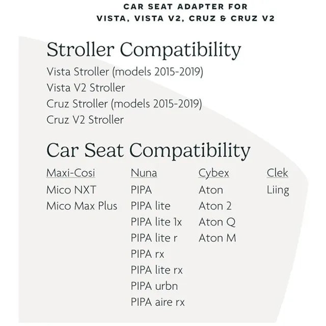 - Compatible with a wide range of infant car seats: Maxi-Cosi?? Mico NXT, Mico Max Plus, Nuna?? PIPAƒ?› series (PIPAƒ?›, Lite, Lite LX, Lite R, Lite Rx, Rx, Urbn), Cybex Aton models (Aton, Aton 2, Aton Q, Aton M), and Clek Liing.