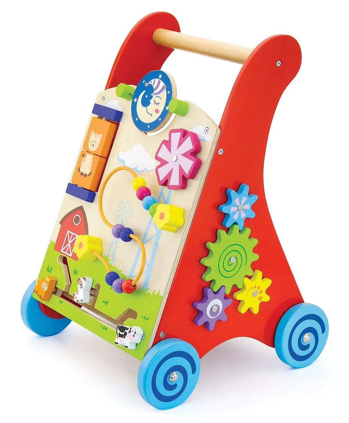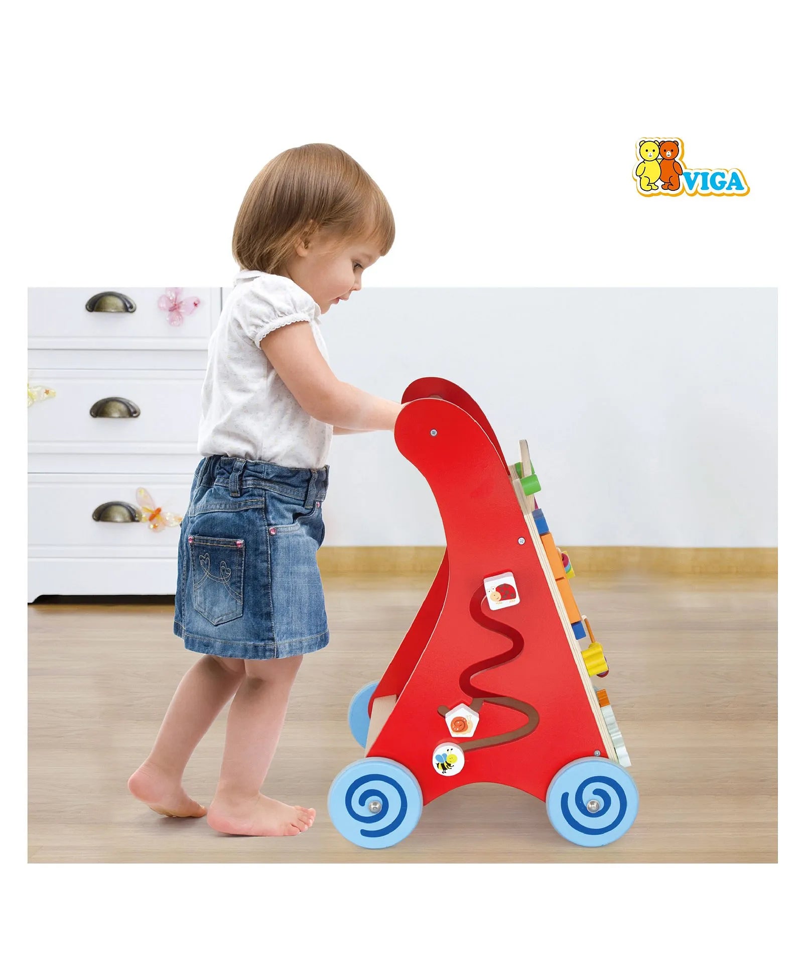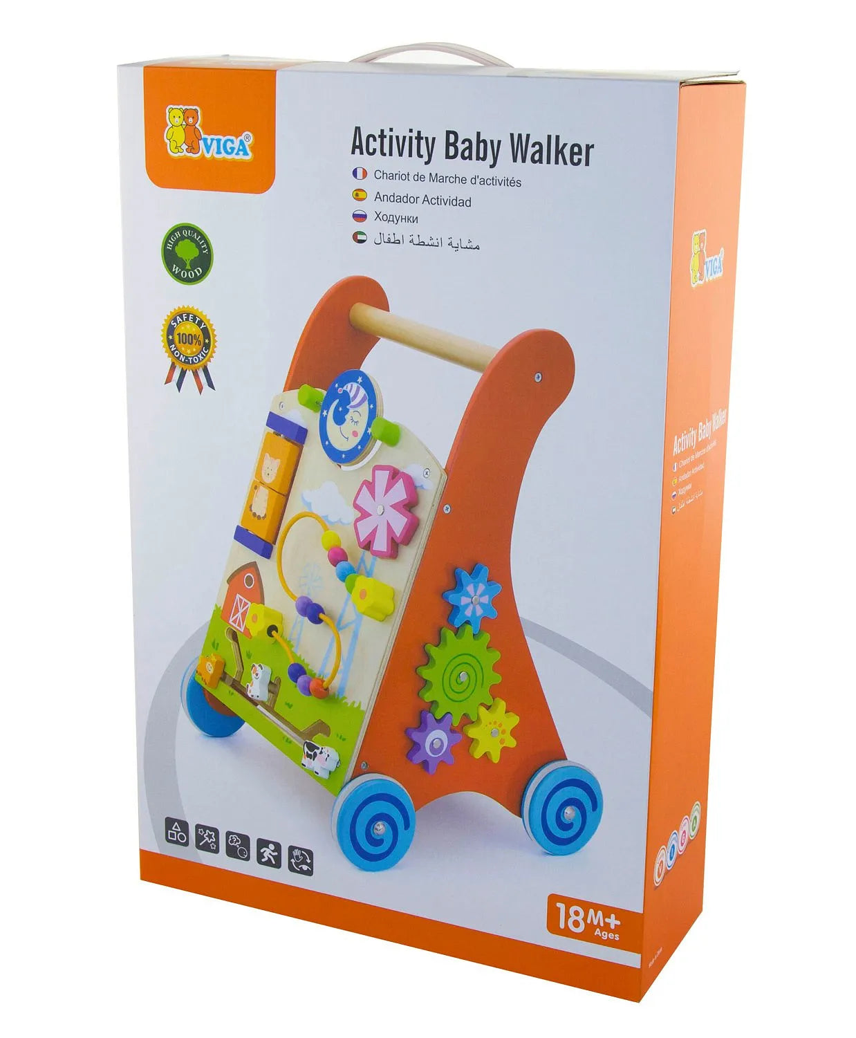 This Viga baby walker is combined with various toys including, farm animal track and trace, wire beads, turnable windmill, sun / moon turning plate on the front, with gears and track and trace blocks on the sides. This can definitely help you kid to learn walking soon