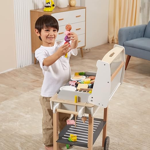 VIGA BBQ Set is a wooden toy barbecue set that comes with 47 accessories, including a grill, wooden skewers, sausage tongs, salt/pepper, ketchup, mustard and food. The buttons on the grill can click and there is a small shelf for storing spices and additives. The grate is retractable and there is a large shelf under the grate. The set is made of high quality wood and the paints and inks are non-toxic.