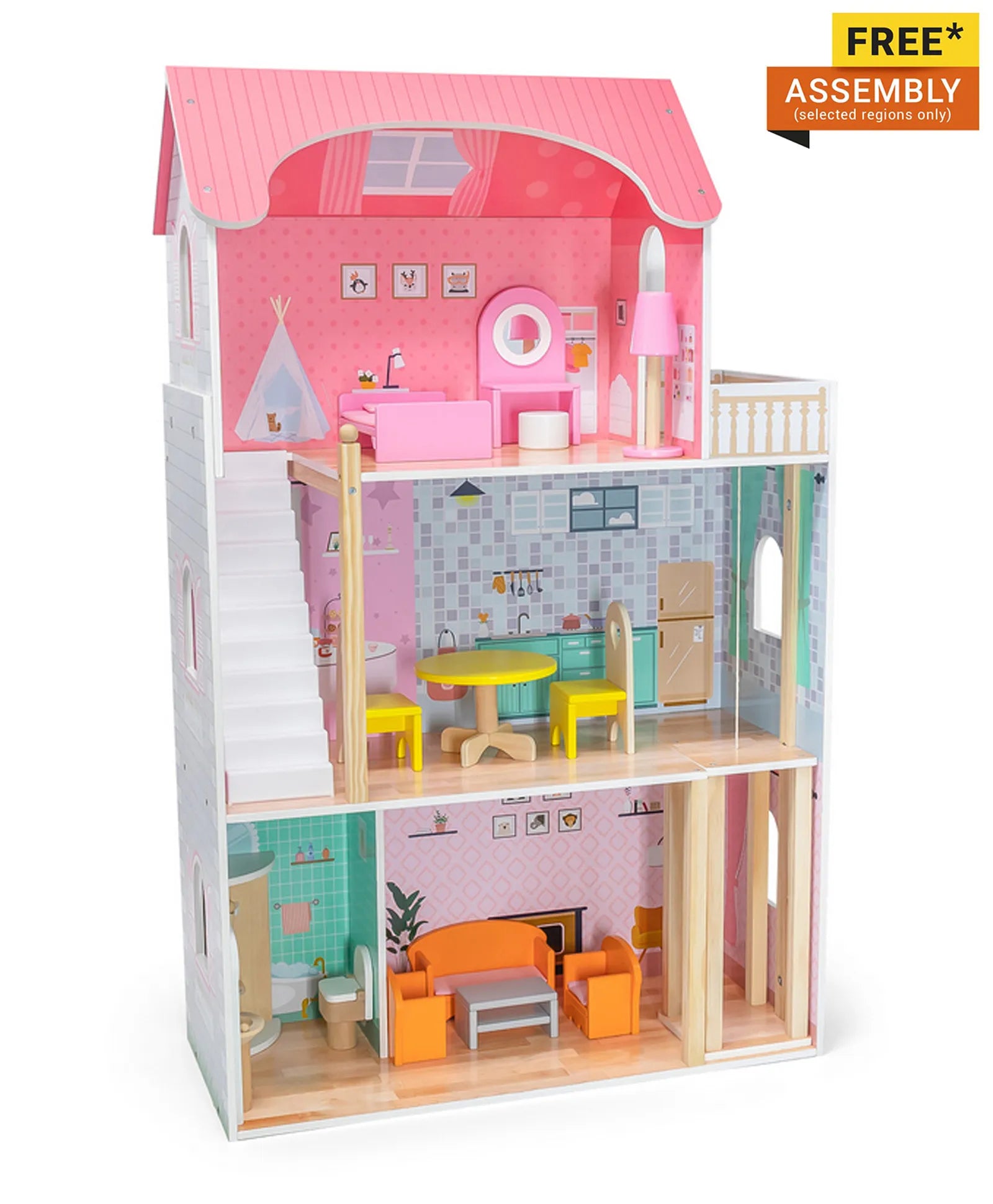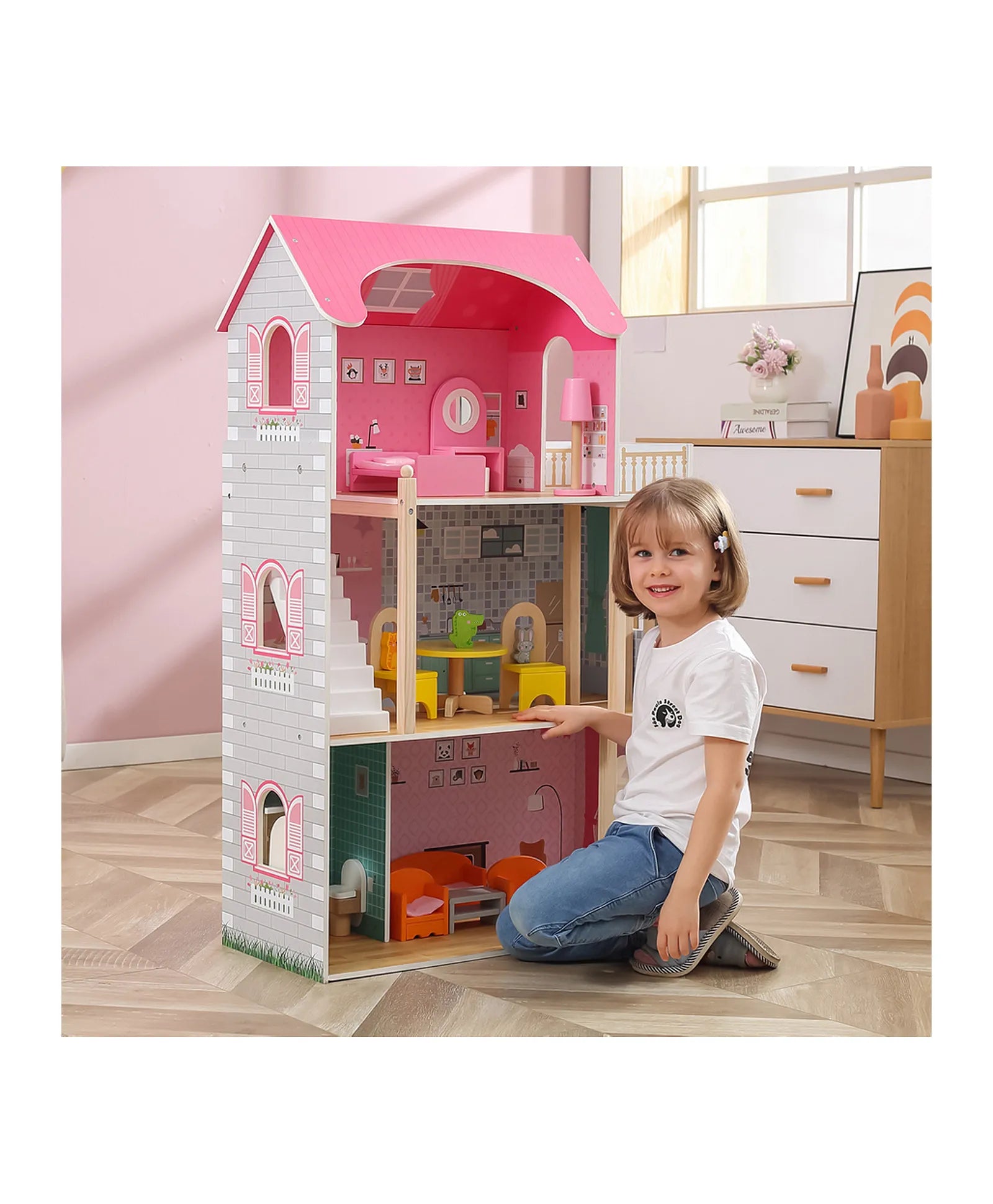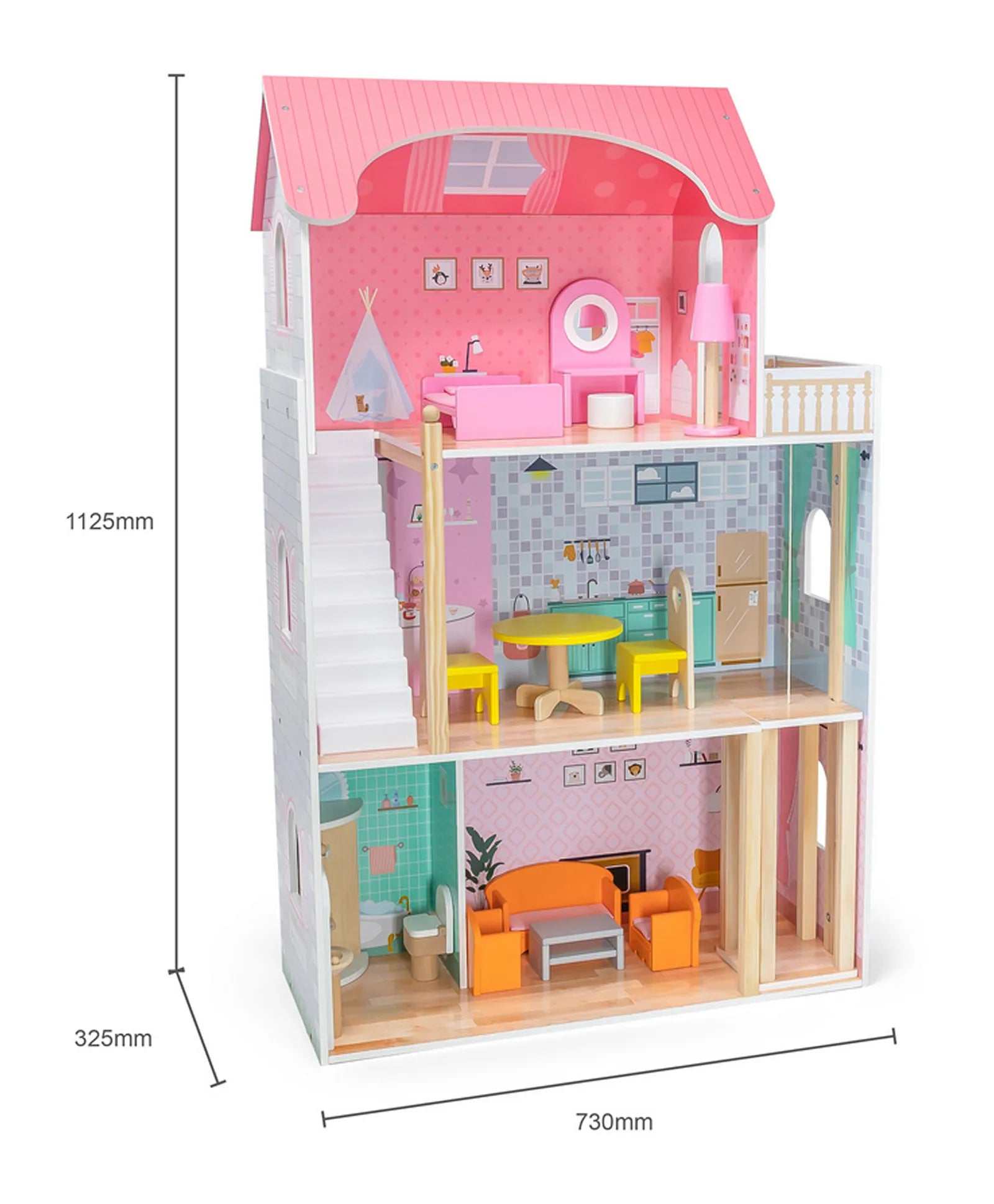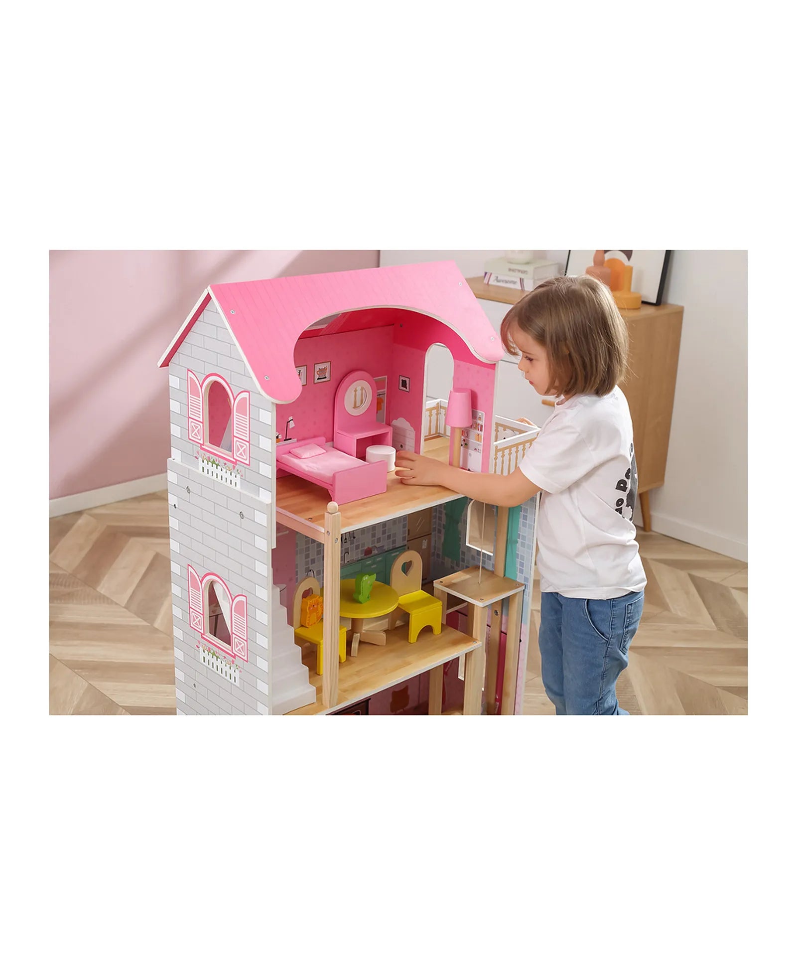 This open sides wooden dollhouse comes in cute colors, which makes it an appealing option for girls. This beautiful fully painted and decorated dolls house offers 3 floors, a kitchen, a bathroom, a living room, a bedroom, a terrace and makes an unforgettable impression. A perfect set to encourage imaginative role play with friends. Enable endless hours of engaging playtime, but also educate children on how to manage the household. Designed to spark imagination and critical thinking