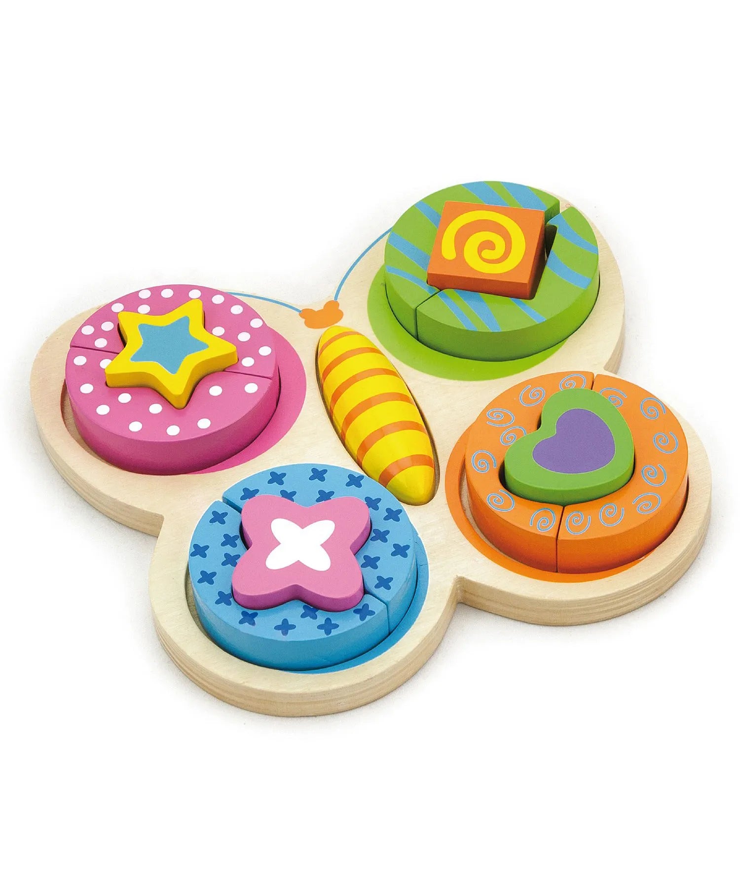 This butterfly puzzle consists of different shape blocks with brilliant colors, painted and printed by hand.