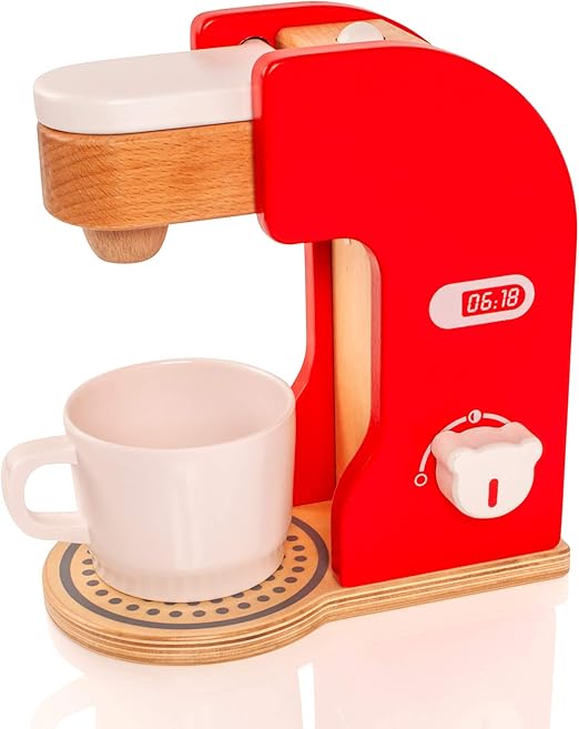 Comes with a coffee maker, a cup and 1 piece of coffee. Turn the switch with a "click" sound to have the machine "work", push the button on top to have a cup of coffee.