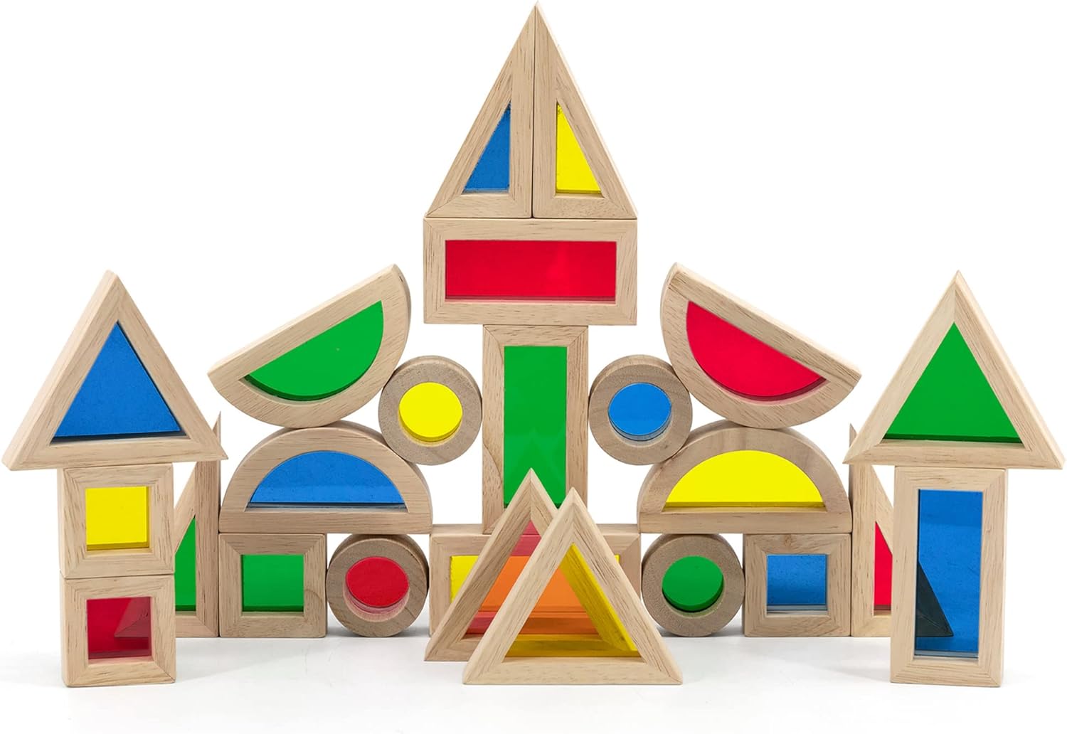 A set of 24 building blocks with transparent acrylic centres, sparking inquiry. Kids can view the changes in colour as pieces are put together and observe the effects of light and diffraction as colourful shadows are cast. Young children love to build, deconstruct, and build again. This wooden block set offers 6 different shapes in 4 different colours. This makes the set a symmetrical wonder. There are no limits to what children can come up with!