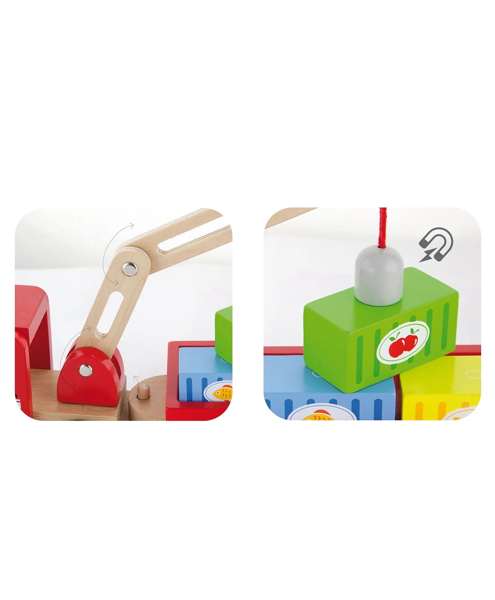 A nice wooden toy of crane truck containing 4 container blocks to play with. The crane stand can turn around and the arm can move up and down perfectly moving the blocks.