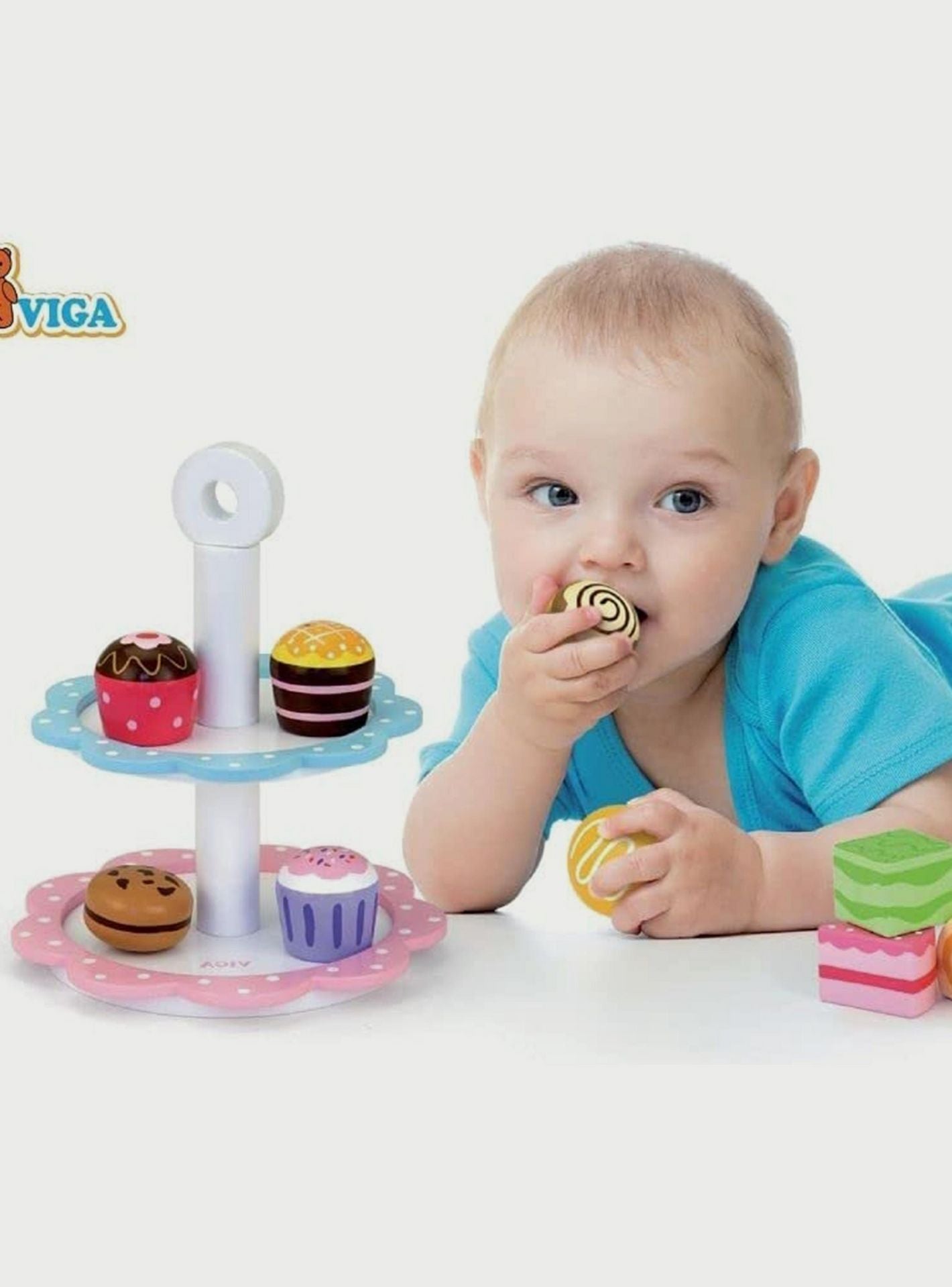 Make teatime more fun and engaging for your little ones with the Viga Teatime Dessert Set with Stand. This wooden play food toy set comes with 9 beautifully designed and realistic cakes that are perfect for small hands to grasp. The 2-tier cake stand adds to the charm of this set and is made of solid wood for durability. Safety is always a top priority for Viga, which is why the toy is made of non-toxic materials that ensure safe play even while the small mouth touches the toy. Your child will love serving and sharing the desserts with their friends during a tea party, which also teaches them about concepts of choice and taste. The Viga Teatime Dessert Set is not just a fun toy, it also enhances your child's imagination and creativity while improving their hand-eye coordination. Watch your little ones enjoy hours of imaginative play with this delightful toy.