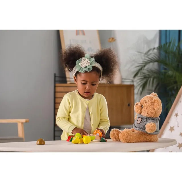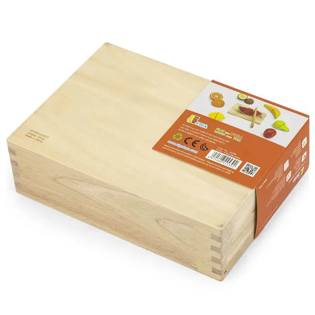 These well-finished wooden food playing sets bring timeless fun. Each set contains wooden cutting board and knife. Cut food in half or several pieces, and fit them back together again with velcro. Comes with a wooden box with acrylic sliding lid for cleaning up and storage.