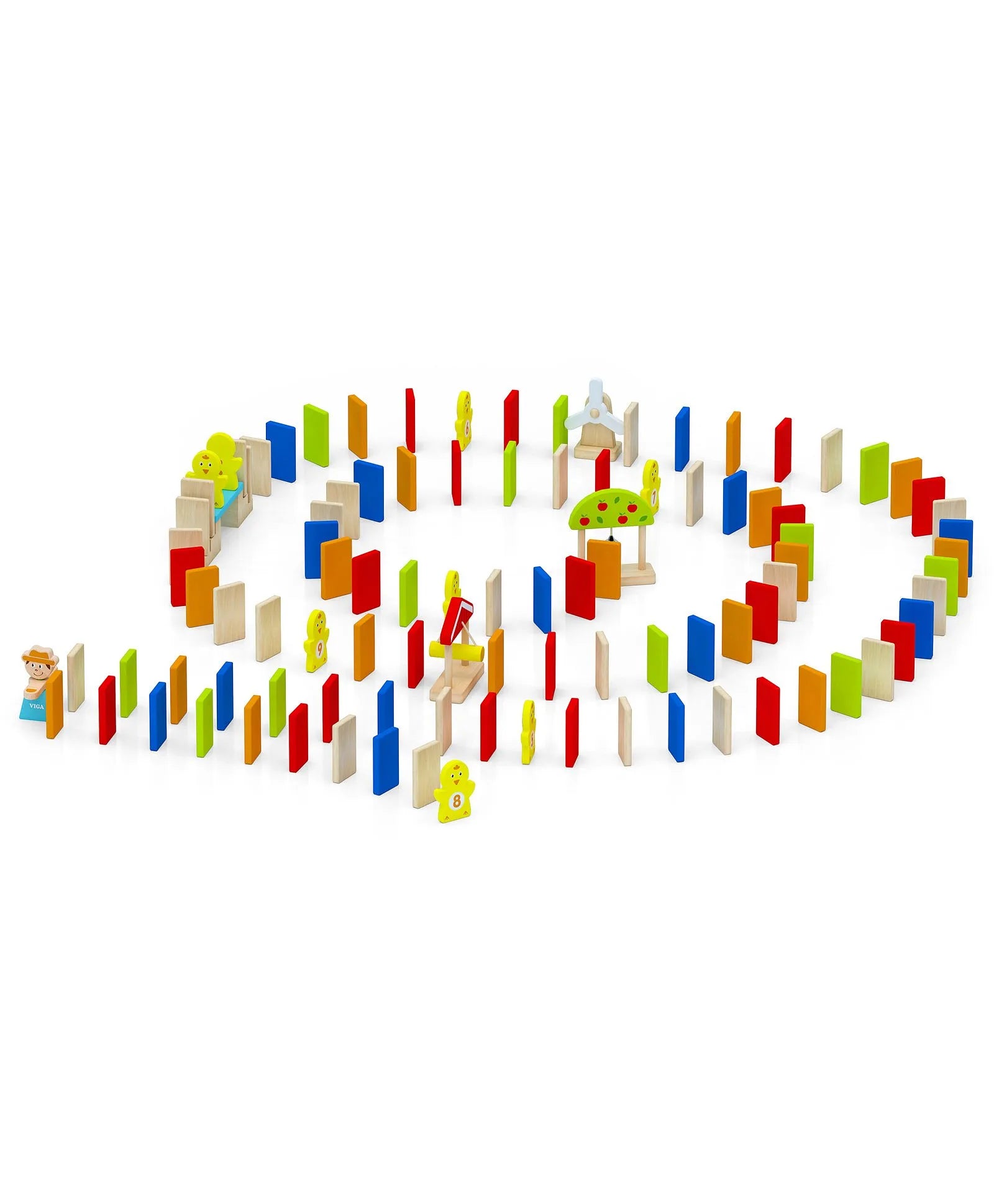 Setting up the colourful wooden domino blocks and accessories and then pushing the very first piece to start the chain reaction of tumbling dominoes is a perfect activity for children of all ages. Toddlers learn and develop skills while playing. Here they develop fine motor skills, hand-eye coordination, critical thinking and planning skills as well as creativity.