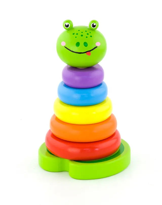 This wooden frog stacker is a timeless toy for little ones to develop motor skills, sorting, ordering and learning about colors and sizes. Includes 5 colorful wooden rings, 1 wooden lotus leaf base,1 cute wooden frog head and a natural wooden pole for stacking. The wooden rings are a perfectly sized for little hands to grasp, move and stack.