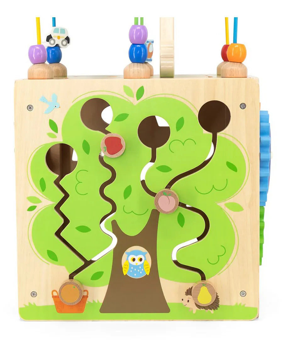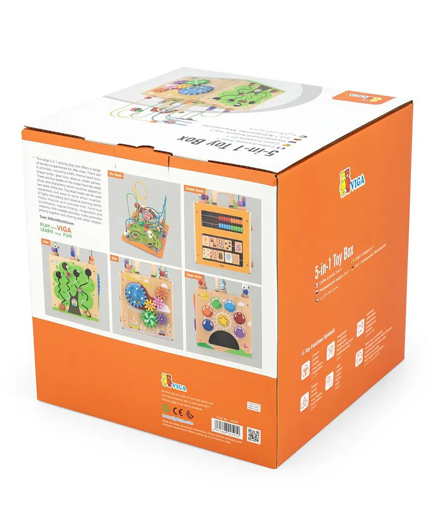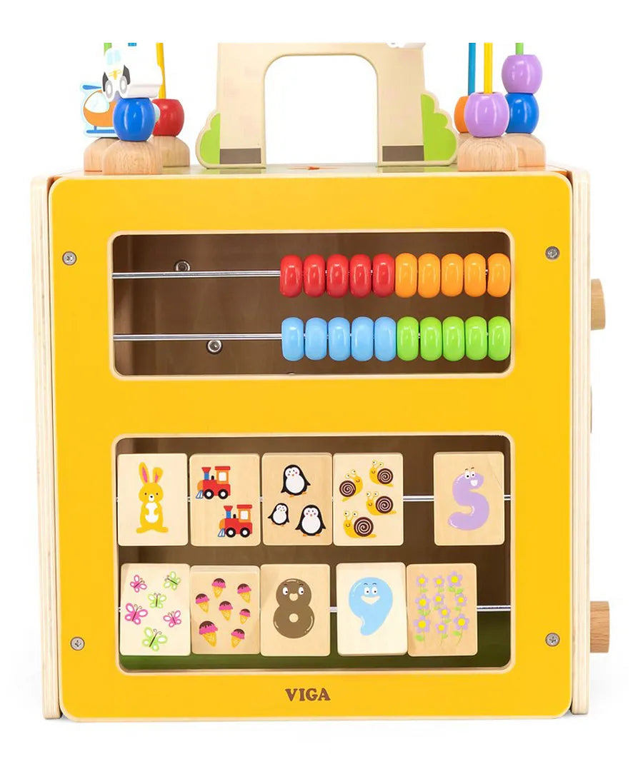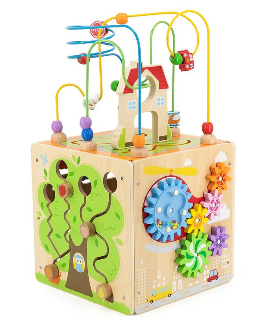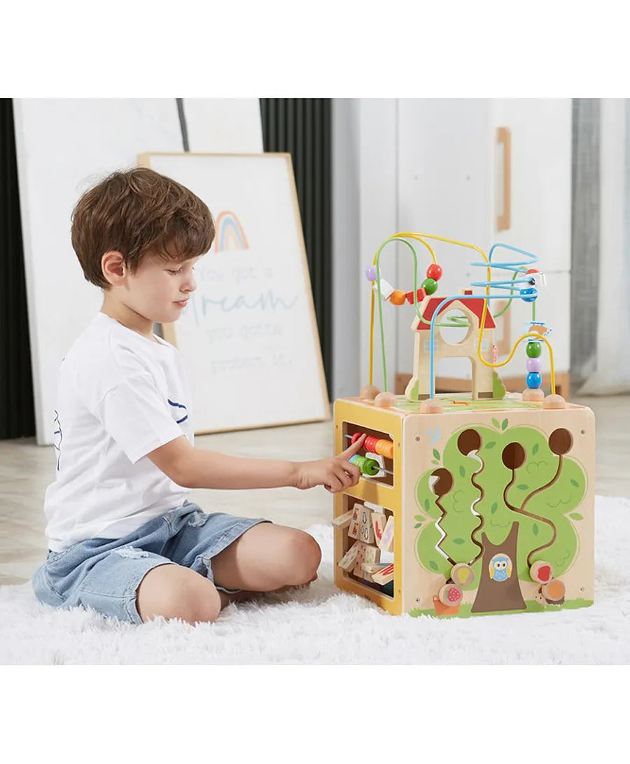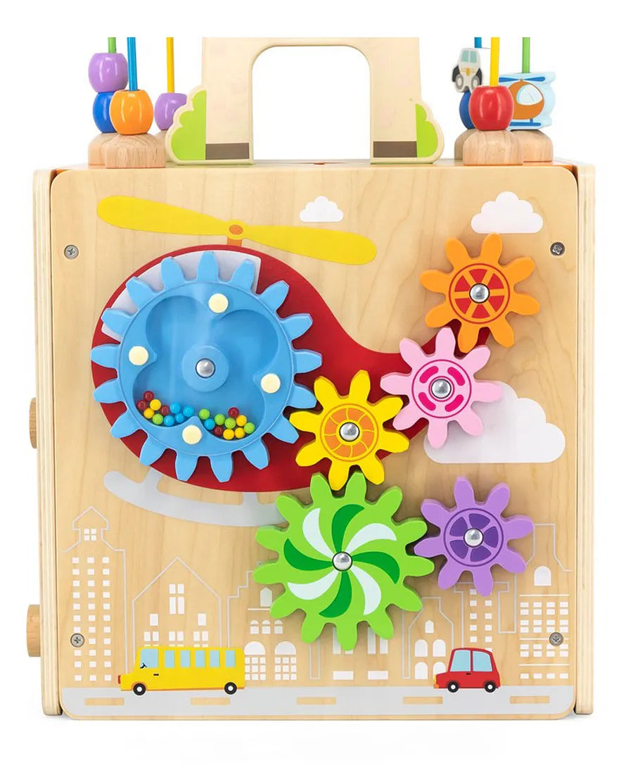 This jumbo activity box comes with 5 different functions. Wire beads, track maze, spinning gears, animal shape sorter, and fire ladder game. On top sits the wire beads with the universe theme blocks, which move along the orbit as if shuttled in the vast space. It also can be turned upside down into a cube, easy to carry and store. Helps improve and cultivate kids hand-eye coordination, logical thinking, imagination, and creativity. Multiple activities, it also promotes playing together and sharing with other children.