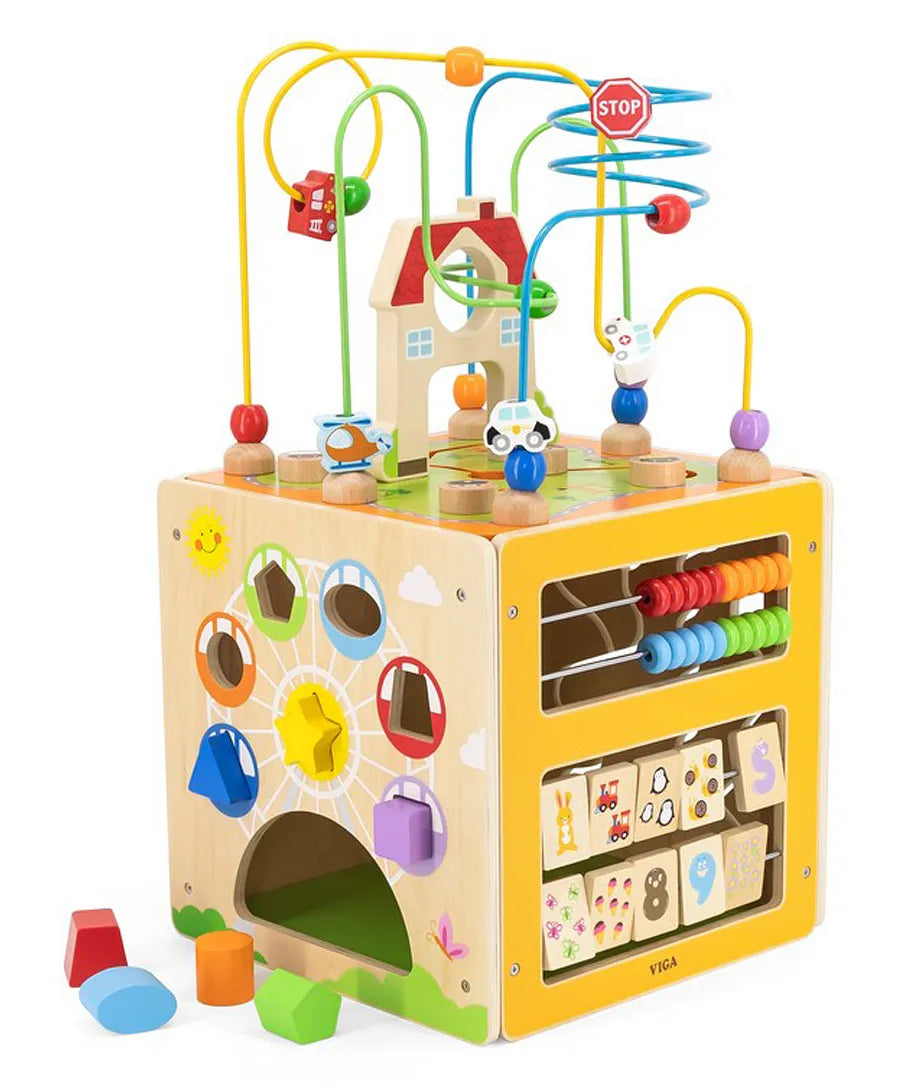 - Wire beads, track maze, spinning gears, animal shape sorter, and fire ladder game