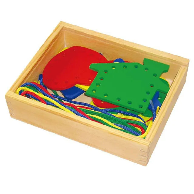 A game that improves hand-eye coordination of the child. The child as to pull the laces through the wooden shapes for development of cognitive skills. No need of needles to do the activity as the laces have tipped ends.